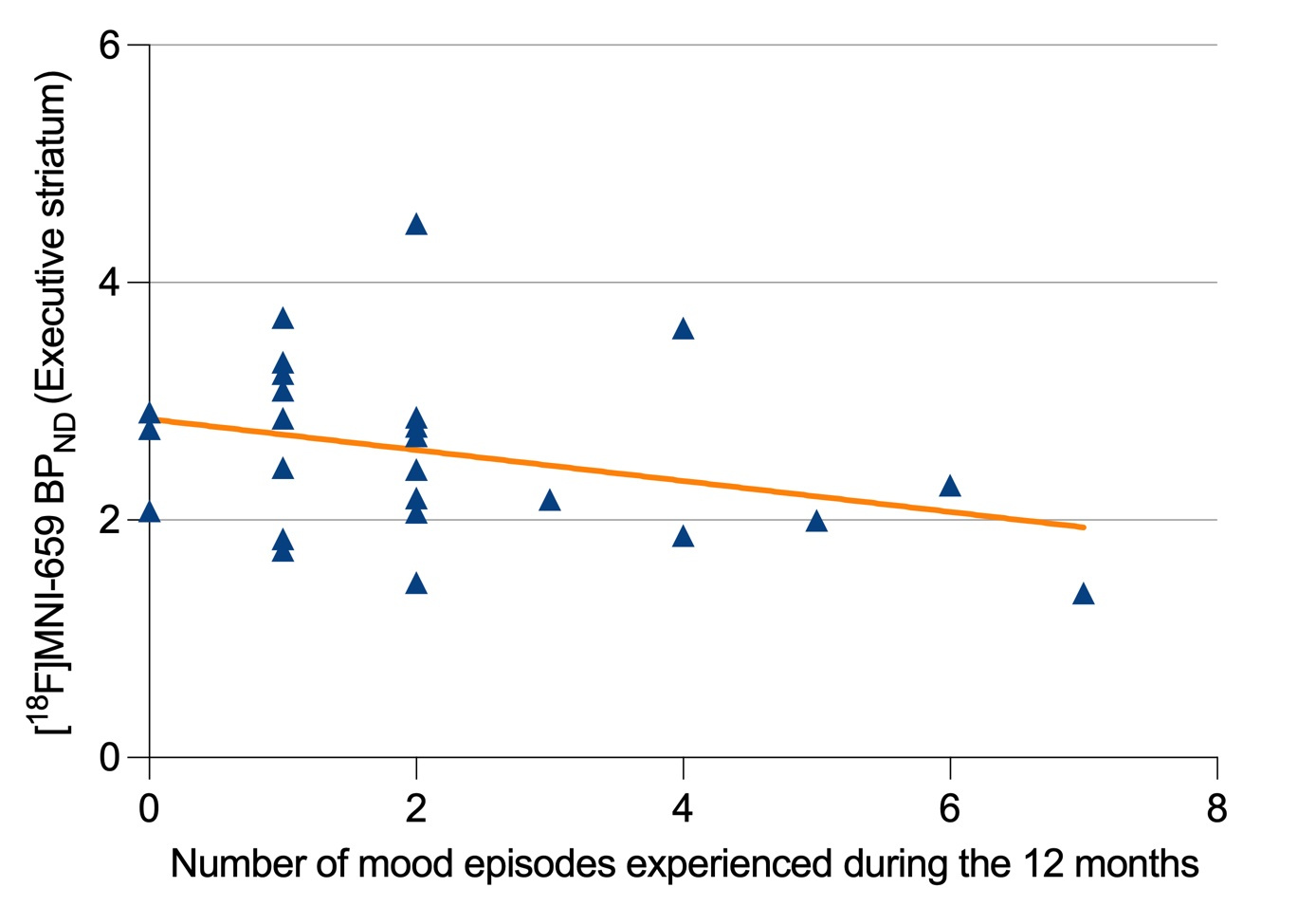 The key finding was that patients with BD-I had significantly lower PDE10A availability in two subregions of the striatum: the executive and sensorimotor areas. The executive subregion, in particular, showed a strong correlation between reduced PDE10A levels and a higher number of mood episodes in the past year. This suggests that diminished PDE10A activity in this area could be linked to a greater risk of recurrent mood episodes, making it a critical area of focus for future research.