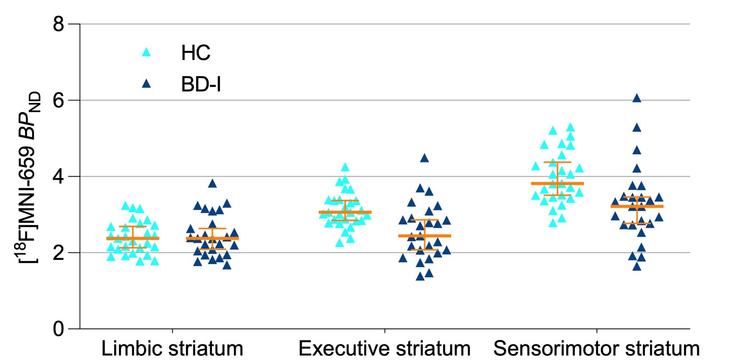 Previous research has hinted at the involvement of dopamine in BD-I, with studies showing that medications targeting dopamine, such as antipsychotics, are effective in reducing the recurrence of mood episodes. However, the results from earlier PET studies examining dopamine signaling in BD-I have been inconsistent. By focusing on PDE10A, a downstream regulator of dopamine signaling, the present study offers a fresh perspective on how dopamine dysfunction may contribute to the pathophysiology of BD-I.