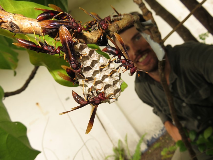 We were here to unpick a specific puzzle about wasp altruism. The wasps of Central and South America are misbehaving. The job description for a wasp is supposed to be simple: help your close family in your own nest, and be mean to everyone else. But these wasps had gone rogue. They were graciously, diligently, and apparently stupidly, also helping the neighbours. In 2005, in a leprosy hospital on a sea-cliff near Panama City, one of my PhD supervisors (Professor Seirian Sumner) had attached minute radio-tags to hundreds of wasps, revealing that – far from forming mean and mutually-murderous colonies – wasps were cheerfully moving between nests and helping to raise supposedly-enemy kids. Wherever wasps of this species set up camp, they form inexplicable networks of vagrant babysitters. This poses a striking challenge for inclusive fitness theory (the established theory for the evolution of social behaviour). Why would a wasp scorn its closest family and help the neighbours instead, who are more distantly related and so are (in the calculus of wasp value) less-useful vehicles for shared genes?