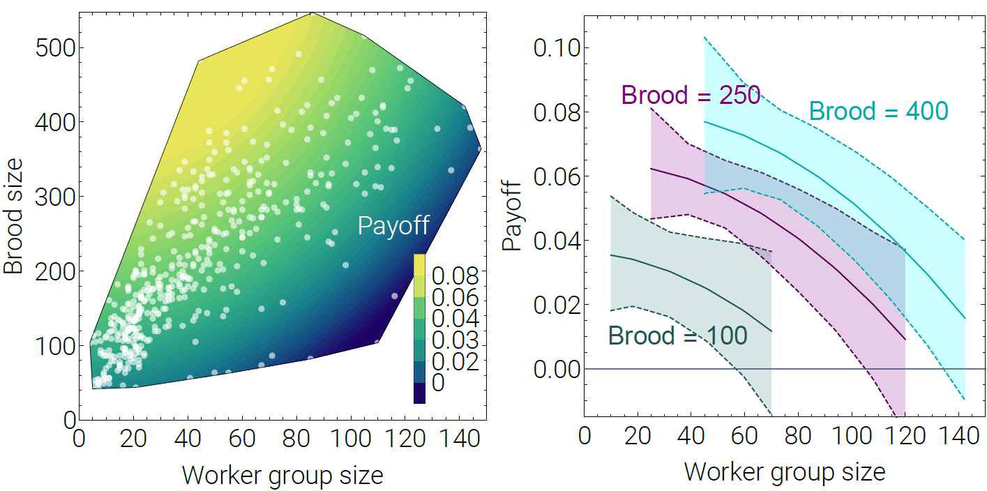 Empirical estimate of the benefit term in Hamilton's rule. Left: The highest predicted benefits (yellower colours) are found on colonies with substantial brood-rearing challenges - those with many brood and relatively fewer workers. Right: 95% credible intervals.