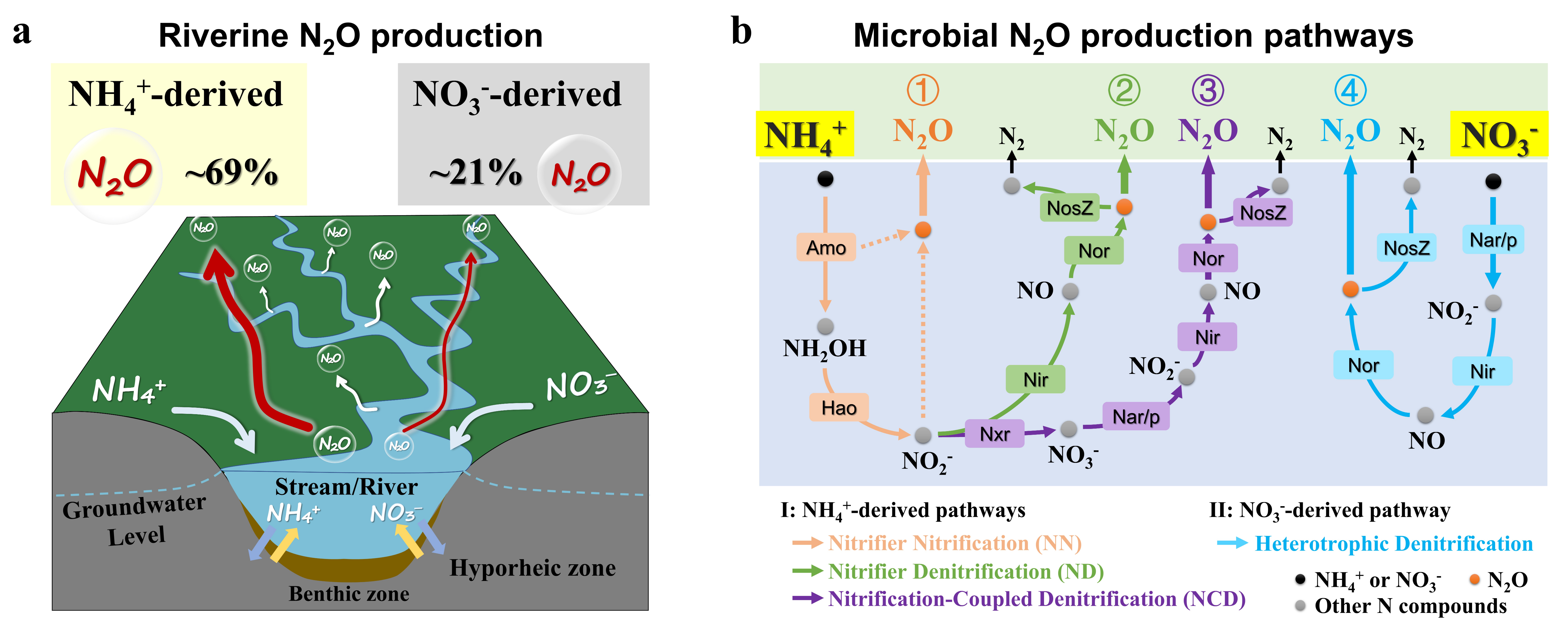 N2O emissions from rivers, estuaries and continental shelves have been the subject of debate for many years. The 5th IPCC Assessment Report proposed that, together, rivers, estuaries and coastal zones emit 0.6 Tg N2O-N yr-1 (based on IPCC’s 2006 guidelines). This corresponds to approximately 3% of all N2O emissions and approximately one-third of the IPCC’s previous estimate of 1.7 Tg N yr-1 in the 4th Assessment Report for the same systems. Several studies have highlighted that emissions from rivers might be underestimated or significantly overestimated in IPCC assessments. In 2020, Prof. Tian Hanqin’s group developed a riverine N2O model within the framework of a dynamic land ecosystem model and reported a fourfold increase in global riverine N2O emissions from 70.4±15.4 Gg N yr-1 in 1900 to 291.3±58.6 Gg N yr-1 in 2016. The small rivers in headwater zones (lower than fourth-order streams) contributed up to 85% of the global riverine N2O emissions, most of which are produced in hyporheic zones (beneath streambeds where stream waters exchange with adjacent sediments). Currently, the microbial mechanisms underlying N2O production in hyporheic exchange zones are largely unknown. These processes may significantly influence global N2O budgets and be potentially severely underestimated.