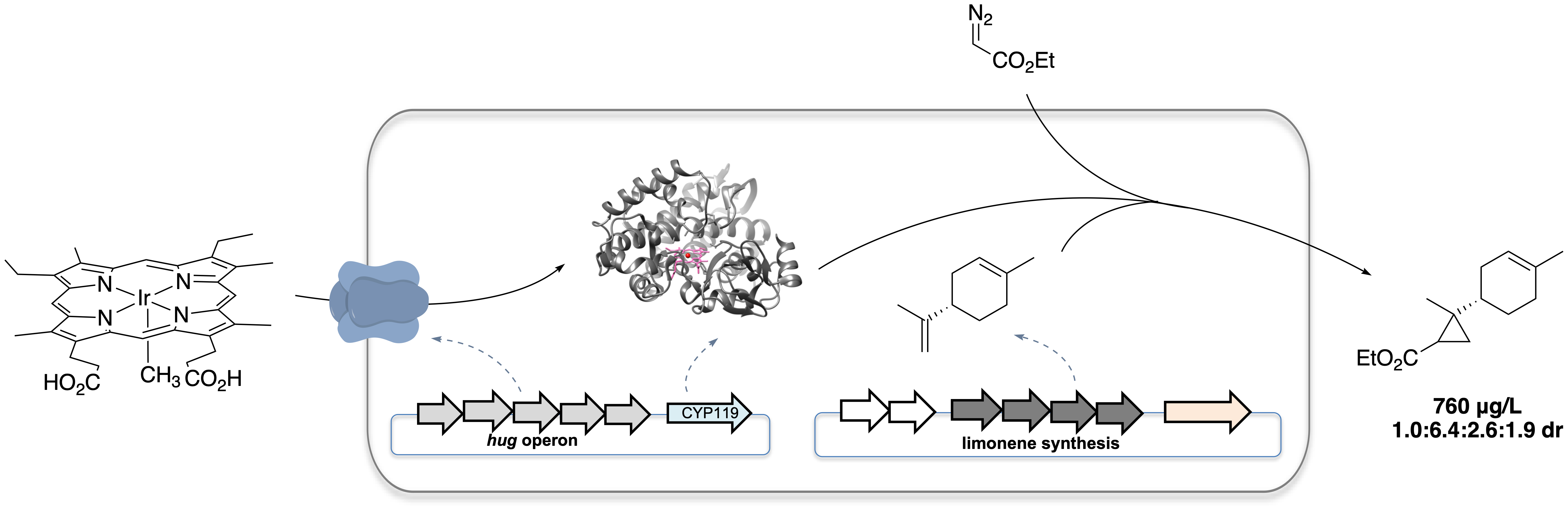 However, incorporation of Ir-CYP119 into a cellular biosynthetic pathway was not straightforward. We found that a balanced expression of enzymes in the terpene pathway and CYP119 was essential to obtain the desired product in substantial amounts. Expressing a limonene biosynthetic pathway heterologously in E. coli could produce limonene with a high titer of 188 mg/L, while co-expressing the pathway with CYP119 regulated by a T7 promoter caused the titer to decrease drastically to 28 mg/L. We therefore needed to express CYP119 with a weaker promoter, such as the lacUV5 promoter, to restore the production of limonene. However, when we attempted to conduct the reaction of (−)-carvone with EDA with cells co-expressing ChuA and CYP119 with the lacUV5 promoter, the cyclopropane was formed with low diastereoselectivity, implying that assembly of the ArM was inefficient under this condition. Thus, efficient incorporation of iridium porphyrin needed to occur with low expression levels of CYP119. Fortunately, an alternative heme transport system, HUG, which expresses the complete Plesiomonas shigelloides heme utilization gene operon, was found to efficiently transport the artificial cofactor and allowed the whole-cell cyclopropanation of (−)-carvone to occur with a high d.r. of 24.0:3.1:1.0:1.2 even with a low expression level of CYP119.