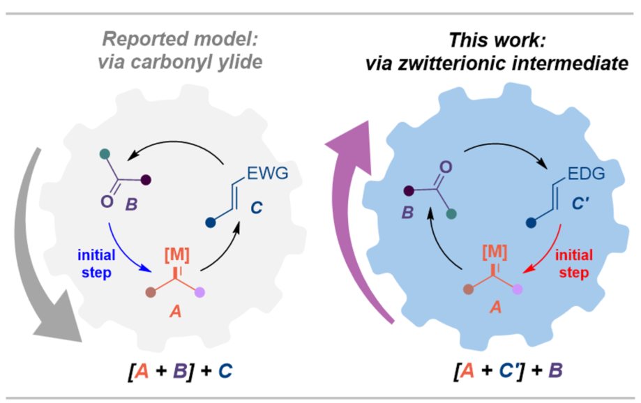 An asymmetric formal [1+2+2]-cycloaddition of readily accessible diazoamides with enamines and carbonyl compounds has been disclosed. This cascade reaction involves a 1,3-dipolar cycloaddition of ketones/aldehydes with the key zwitterionic intermediate that generated in situ through metal carbene transfer to nucleophilic enamines, which provides a direct access to spiro-tetrahydrofurans containing four consecutive stereocenters in high yields and excellent enantioselectivity. Notably, this cycloaddition reaction offers a complementary protocol for the stereoselective construction of chiral tetrahydrofurans, which are regioisomers of those formed by traditional [3+2]-cycloadditions, such as [3+2]-cycloaddition of carbonyl ylide with alkenes , or [3+2]-annulation using donor-acceptor cyclopropanes as C3 building blocks.