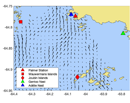 From these data, we were able to map each level of the food web onto the dynamic ocean surface currents! We found that penguins visit certain features of the ocean as if going to marine “grocery stores”. Their food is grown elsewhere and transported to these patches of increased food availability, their “grocery store”. Read our manuscript to learn more about how ocean currents concentrate prey patches into “grocery stores” that are then visited by penguins!
