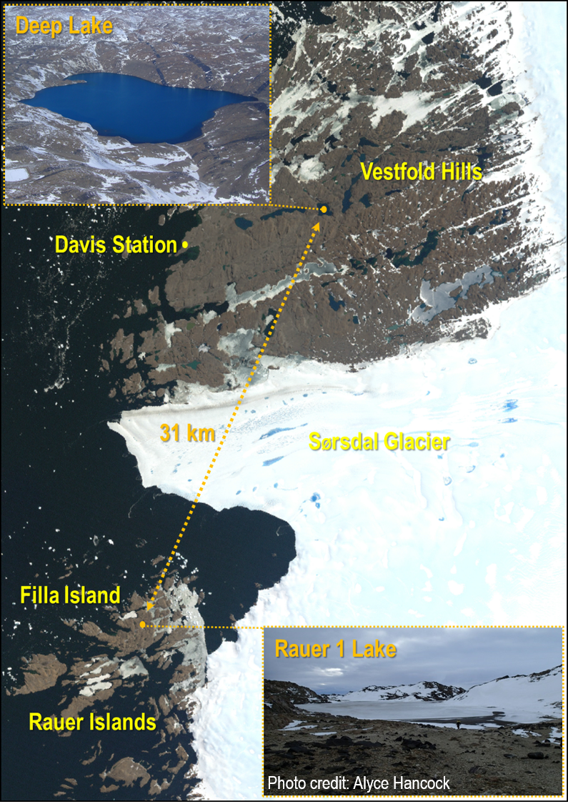 The Antarctic continent also harbours diverse lake systems – from subglacial behemoths like Lake Vostok and ancient wonders oozing out Blood Falls, to the plethora of diverse, marine-derived systems in the Vestfold Hills and Rauer Islands near Australia’s Davis research station. The Vestfold Hills’ lakes are each, in effect, unique time capsules that show us how marine life has evolved after being isolated from the ocean about 3-5,000 years ago. Because of the limited nutrient input, changes in oxygen levels, salinity and overall geochemistry, the biology of these systems has become progressively microbially dominated, supporting the existence of few, higher-trophic (metazoan) predators. During this remarkable evolutionary process, viruses have emerged as particularly key components of the communities, affecting community dynamics, productivity and nutrient cycling, and the flow of genes between community members.