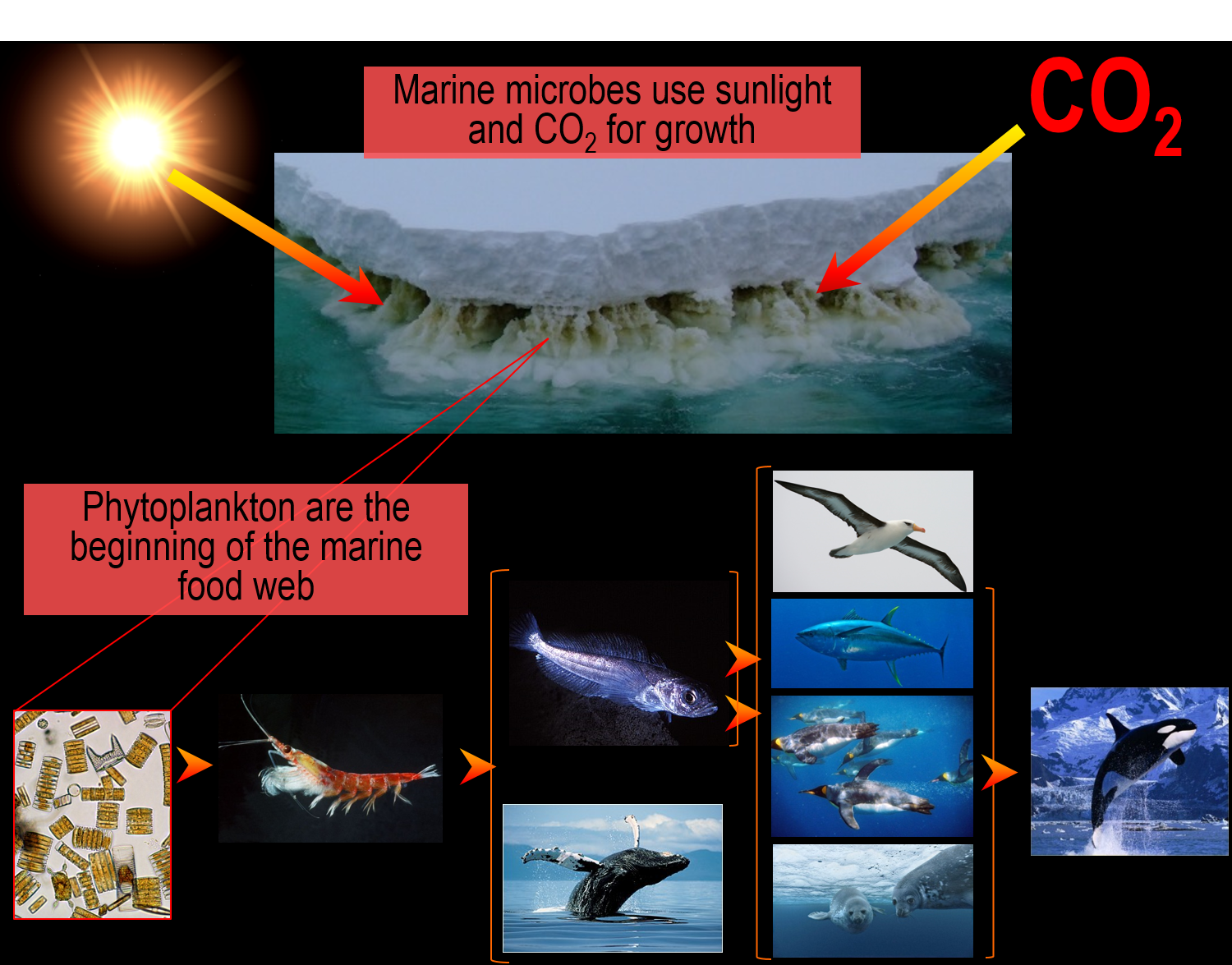 Beyond Antarctica’s visual splendour lies a whole other level of wonder – the microbial world – the unseen majority that controls ecosystem function. Globally, environmental microorganisms literally make the world go around – not physically, but in terms of performing nutrient cycling that maintains the existence of all other life forms, and hence, the health on the planet. Antarctica’s Southern Ocean microorganisms fix a disproportionately large amount of the world’s carbon dioxide, using the Sun’s light as energy to grow into massive blooms in seawater and form dense brown communities within sea ice – notably, the Antarctic sea ice extent represents the largest physical seasonal change on the planet, growing up to 20 million km2 through winter and then largely melting away in summer. The marine food-web starts with primary producing phytoplankton and heterotrophic remineralizing microorganisms and branches out through krill to all other macroscopic marine life – sponges, fish, sea birds and sea mammals.