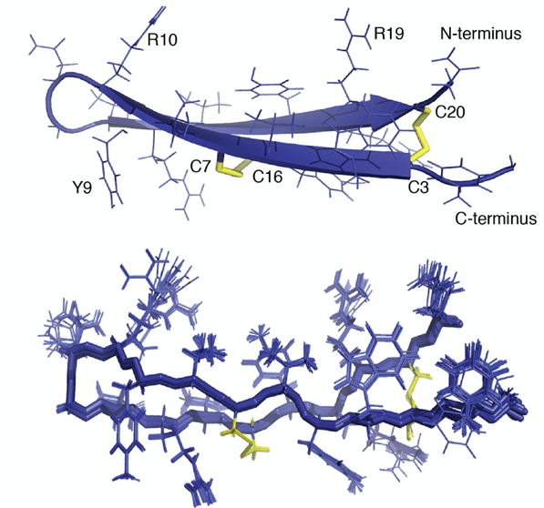 However, given the remarkable spectra of action of the series with activity against multi drug- and extensively drug-resistant bacteria (MDR & XDR), and the lack of alternatives in the pipeline, the project was worth pursuing. We worked together to refine key properties of the molecules by determining the NMR solution structure, arenicin-3. This was done in free solution and also on lipid membrane nanodiscs. Together with data from empirical testing on bacteria and human cells, pharmacokinetics and toxicokinetics, this led us to focus on one arenicin derivative, AA139. In murine models of peritonitis, pneumonia and urinary tract infections, this new antibiotic resulted in a 1,000-10,000 fold reduction in bacterial burden.