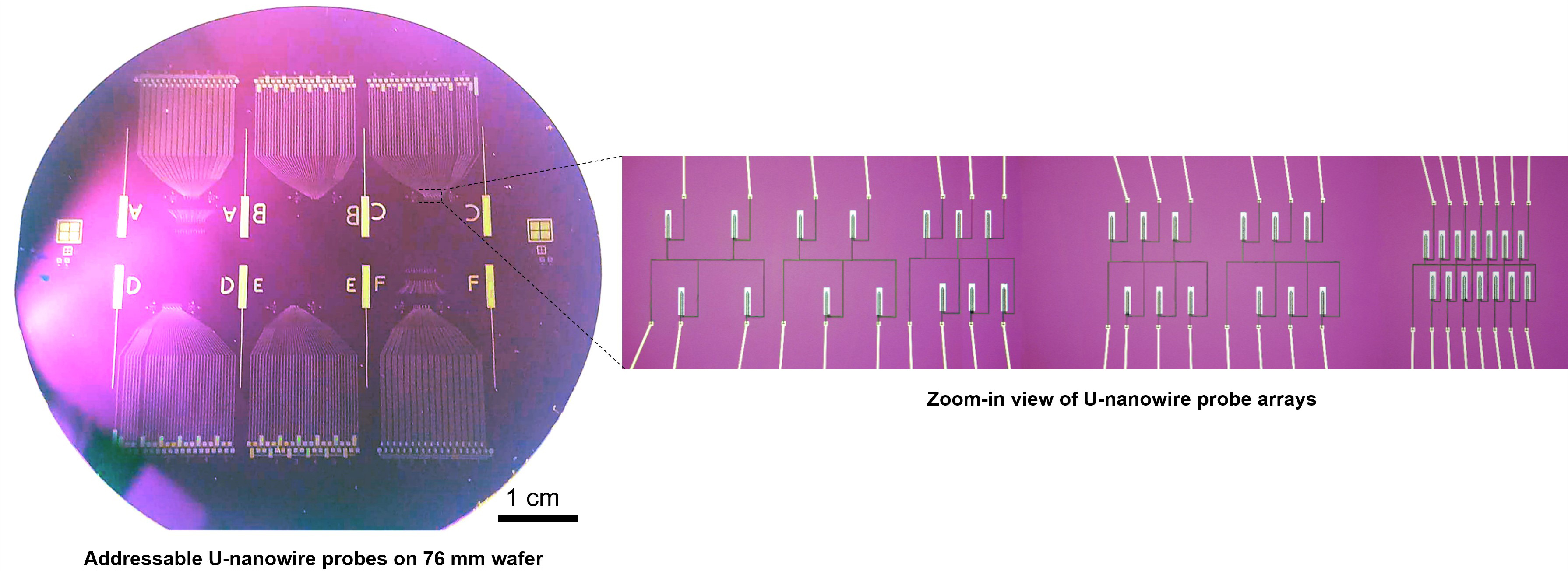 The straight silicon nanowires, with very high length-to-width ratio, are as flexible as cooked noodles. To incorporate them into device arrays, we first made patterned a silicon wafer with U-shaped trenches, and then ‘combed’ the nanowires over the trenches. In addition to removing tangles from the nanowire hair, the combing shear force deforms the nanowires to conform to the designed U-shapes of the trenches, thus forming an array of ‘hairpin’-like U-shaped nanoscale devices. The tip of each U-shaped nanowire, which points up from the chip surface by virtue of ‘designed’ strain in the bimetallic interconnects, is modified to act as a small transistor that, similar to the V-shaped nanowires, can be inserted into neuronal and cardiac cells for intracellular recording with signals comparable to the quality of those obtained with the gold-standard patch-clamp electrodes. Because the nanowire tips are so small and coated with a layer of molecules that mimic the cell membrane, they can be inserted into multiple cells in parallel without causing damage.