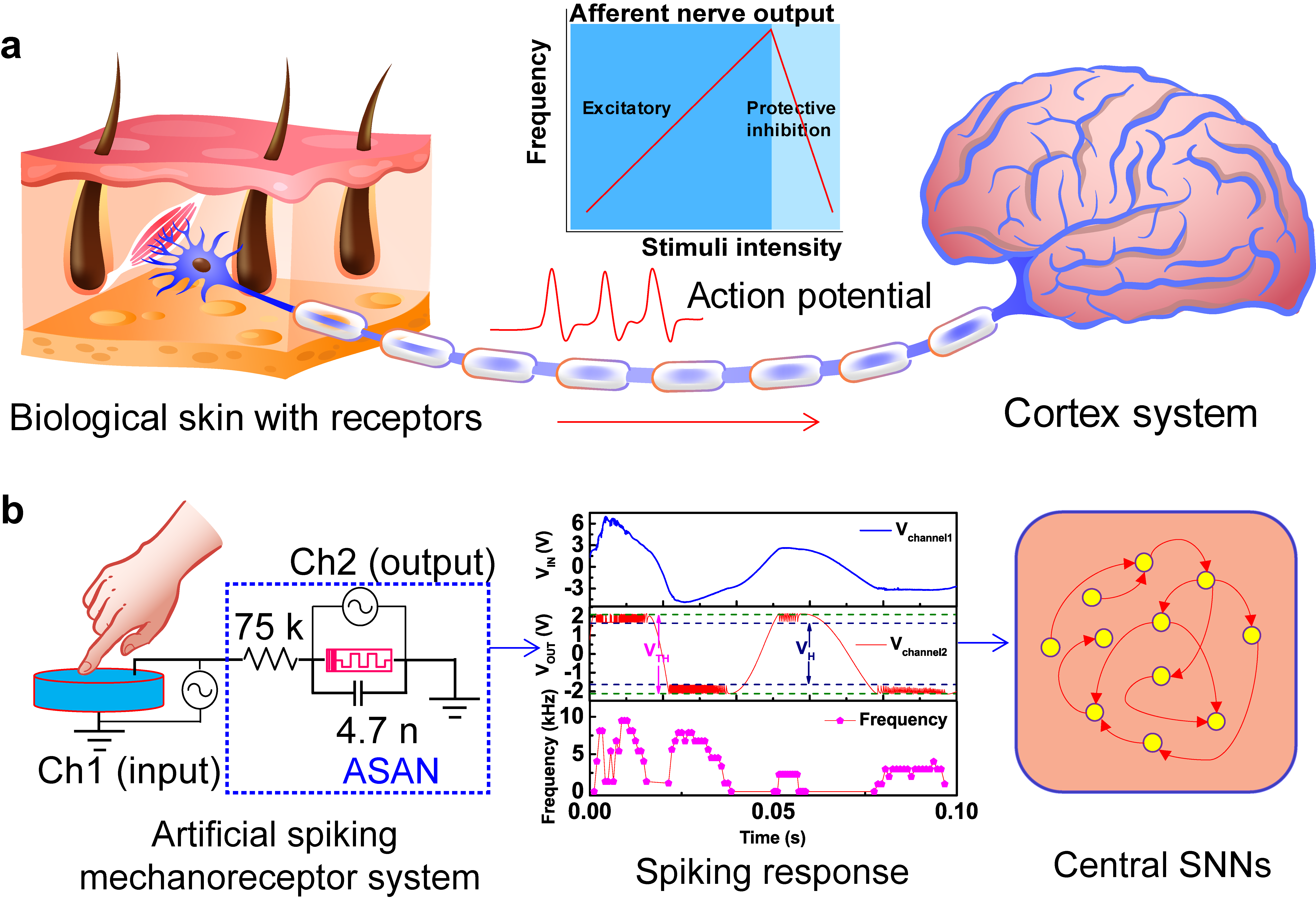 In this work, researchers from Umass Amherst, IMECAS, and University of Chinese Academy of Sciences (UCAS) teamed up to implement an artificial spiking afferent nerve (ASAN) as interface using specifically engineered NbOx Mott memristors. The ASAN can transform analog signals into dynamic spiking frequencies. The frequency of the ASAN has a quasi-linear relationship to the input voltage under non-noxious stimuli intensity and tends to stop firing under noxious input intensity, closely resembling a biological afferent nerve. The dynamic spiking behavior under various input signals, such as rectangular, triangular, and sinusoidal pulses, was studied systematically. To confirm the system application, the researchers further connect the ASAN with a piezoelectric sensor to construct an artificial spiking mechanoreceptor system (ASMS) without any external power source. The ASMS can respond to the pressure signals and transform the pressure intensity into a corresponding spiking frequency.
