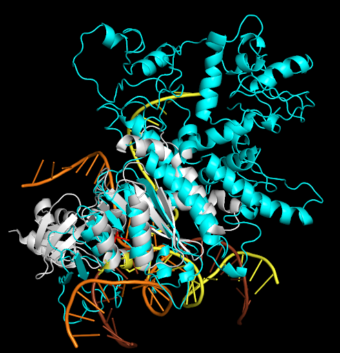 Structural model of PB (Cyan) superimposed on the structure of the HIV integrase intasome (PBD 5U1C) (only one integrase monomer shown in white, target DNA shown as double stranded).