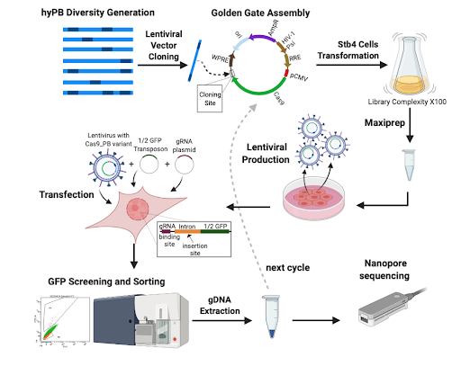 Excited by the idea that a small set of mutations could greatly improve the activity of FICAT, we tried to set up a screening that could assess the activity of thousands of hundreds of mutants in a single well plate. For this, we built a celular reporter that harbored half of a GFP protein. We then delivered the other half of the GFP as a transposon message, and targeted it with FiCAT upstream of the celular half, in order that targeted integration events would generate a fluorescent protein. Since the transposon gene is flanked by ITRs, we added an intron, so that the GFP protein sequence would not get disrupted by the ITR. This reporter system allowed us to deliver thousands of variants of FiCAT into a cell population, and then sort cells that expressed GFP. We expected best performing variants to be overrepresented in the GFP positive population. An important detail was that for the screening to work we required to only deliver one FiCAT variant per reporter cell. To achieve this, we encoded the library of FICAT variants in a lentiviral vector, which also provided easy retrieval of the DNA that encoded the enhanced variants.