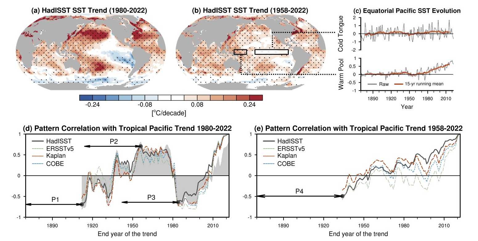 Fig. 1. Recurrent and emerging sea surface temperature (SST) trend patterns in the tropical Pacific. The SST trend (°C Per decade) based on HadISST during (a) 1980-2022 and (b) 1958-2022. Dots in (a-b) indicate the trend exceeding the 95% confidence level. (c) Timeseries of raw (black dashed lines) and 15-year running mean (red solid lines) annual-mean SST anomalies in the cold tongue (top panel; 5°S–5°N, 190°W–270°W) and the warm pool (bottom panel; 5°S–5°N, 140°E–170°W). The SST anomalies were calculated relative to the climatology of the first 50 years (1870-1919). (d) Pattern correlations of 43-year SST trends in the tropical Pacific region (30S-30N, 120E-270W) in historical period with the trend during 1980-2022 based on HadISST (black solid line), ERSSTv5 (green dashed line), Kaplan (red dotted line) and COBE (blue dashed line). Shading in (d) indicates pattern correlations of 43-year SST trends in the tropical Pacific region with the Interdecadal Pacific Oscillation (IPO) pattern based on HadISST. (e) Similar to (d) but for 65-year SST trends with the trend during 1958-2022. Arrows labeled P1 (1870-1912), P2 (1914-1956) and P3 (1942-1984) indicate the periods with strongest positive and negative correlations in (d) and P4 (1870-1934) with strongest negative correlation in (e).