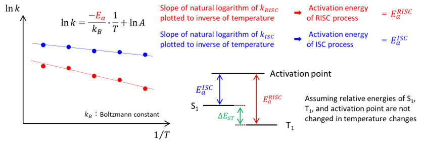 Recent computational and experimental studies have shown that efficient S₁–T₁ conversion in TADF systems often involves higher-lying triplet states (Tn). Our group previously reported this in 2019 (Nat. Mater. 2019, 18, 1084). However, this concept had not yet been applied to the experimental kinetic estimation of ΔEST.