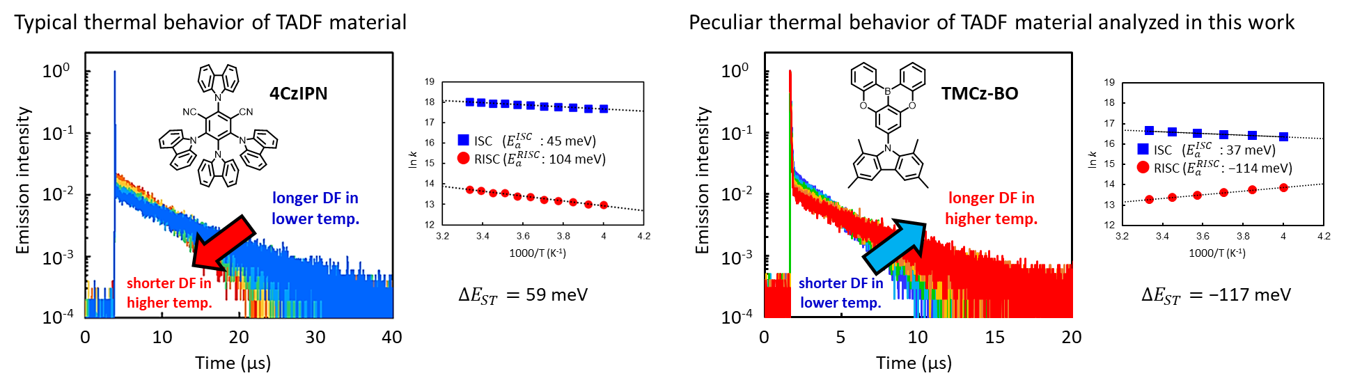 We then studied a TADF material, TMCz-BO. TADF is characterized by thermally activated delayed fluorescence—higher temperatures increase the proportion of delayed fluorescence and shorten its lifetime. TMCz-BO, reported by our group in 2020 (Nat. Commun. 2020, 11, 1765), exhibits a sub-microsecond delayed fluorescence lifetime. To explore its luminescence mechanism in more detail, we measured transient photoluminescence in toluene and observed an anomalous behavior: the proportion of delayed fluorescence increased, and the lifetime shortened at lower temperatures—the opposite of typical TADF behavior. Furthermore, conventional analysis yielded negative values for both the activation energy (Ea) of RISC process and ΔEST (Fig. 4).