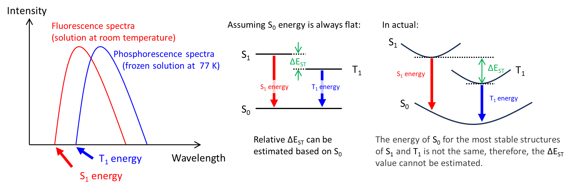 In TADF material development, we have frequently encountered challenges in accurately determining the energy configuration of excitonic states. Minimizing the singlet–triplet energy gap (ΔEST) is key to achieving efficient TADF performance. However, we were surprised to discover a lack of reliable experimental methods to directly determine this gap. Typically, S₁ and T₁ energies are estimated from the onsets of fluorescence and phosphorescence spectra, respectively (Fig. 2). Yet, some materials exhibit phosphorescence at shorter wavelengths than fluorescence. Some researchers suggest using the shortest vibronic peak in the phosphorescence spectrum to estimate T₁, which can be effective in certain cases, but not universally. Others propose that the observed phosphorescence may arise from higher-lying triplet states (Tn). Despite extensive discussion, a consensus remains elusive. Moreover, a critical issue in ΔEST estimation from spectra is the underlying assumption that the ground-state energy (S0) remains constant across all conditions. Thus, our conclusion is that while spectral methods can yield reasonable transition energies for individual states, they are not reliable for determining ΔEST due to their inherent subjectivity.