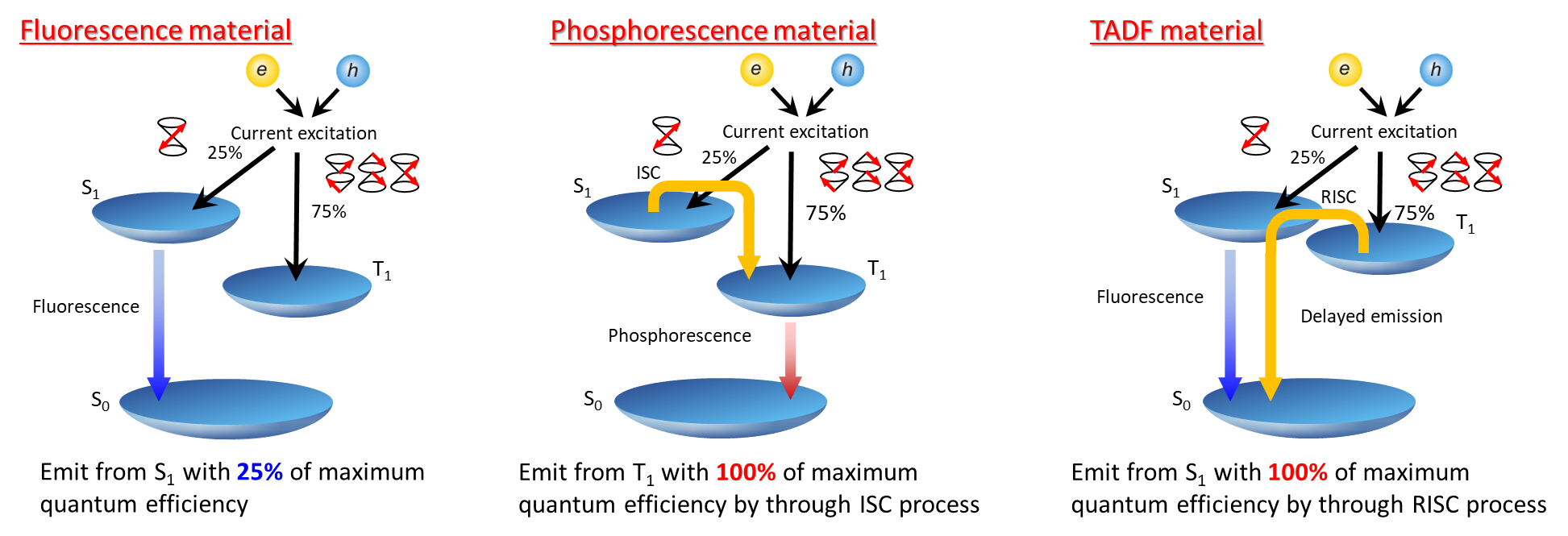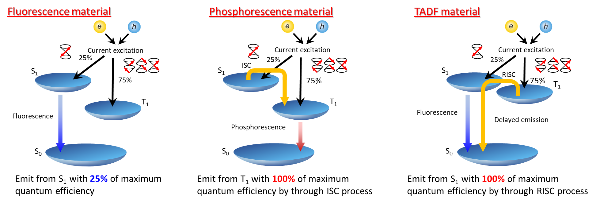 As illustrated in Fig. 1, electrical excitation generates excitons in a 1:3 ratio of singlet to triplet states. First-generation OLEDs, which utilize fluorescent emitters, can harvest only the singlet excitons, leaving triplets unused, an efficiency of 25%. A major breakthrough came with phosphorescent materials, which achieve nearly 100% internal quantum efficiency through the harvesting of triplets via intersystem crossing (ISC). TADF materials also reach 100% efficiency, but through reverse intersystem crossing (RISC), enabling triplet excitons to upconvert to the singlet state (S₁) and emit light. We believe TADF materials are transformative not only for OLED technology but for the broader field of photophysics.