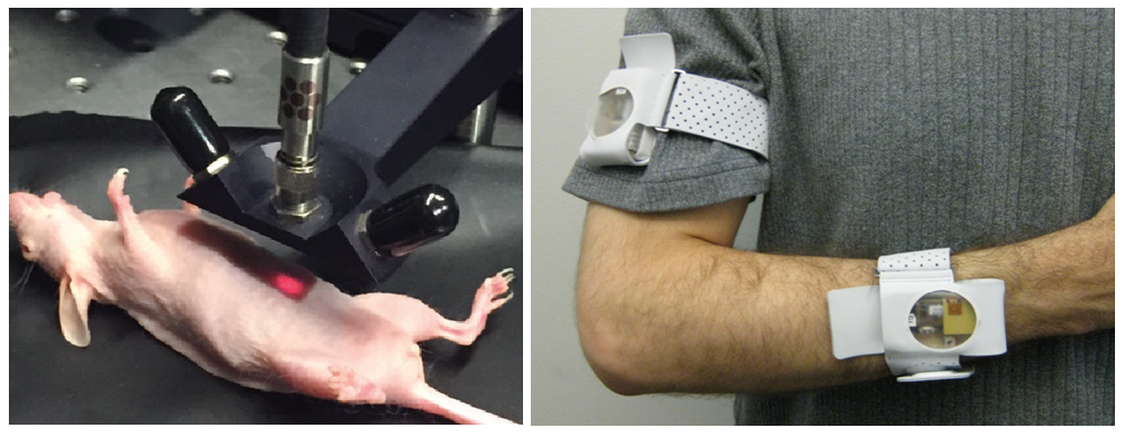 Figure 2: (Left) Non-invasive miRNA measurement via the implanted sensor upon excitation with red light. (Right) Example of a wearable medical device for continuous monitoring of motion (image taken from Mukhopadhyay [8]).