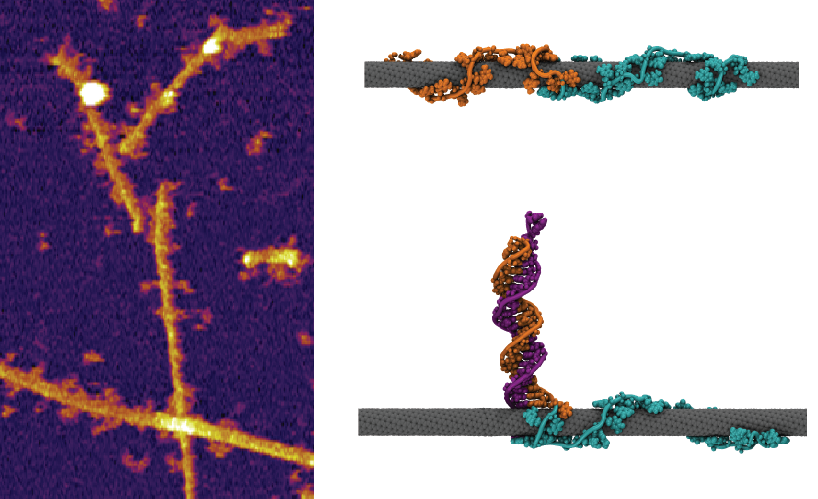 Figure 1: (Left) Atomic force microscope image of the nanotube sensor bound to target oligonucleotide. (Right) Snapshots from our molecular dynamics simulation of the hybridized sensor complex.
