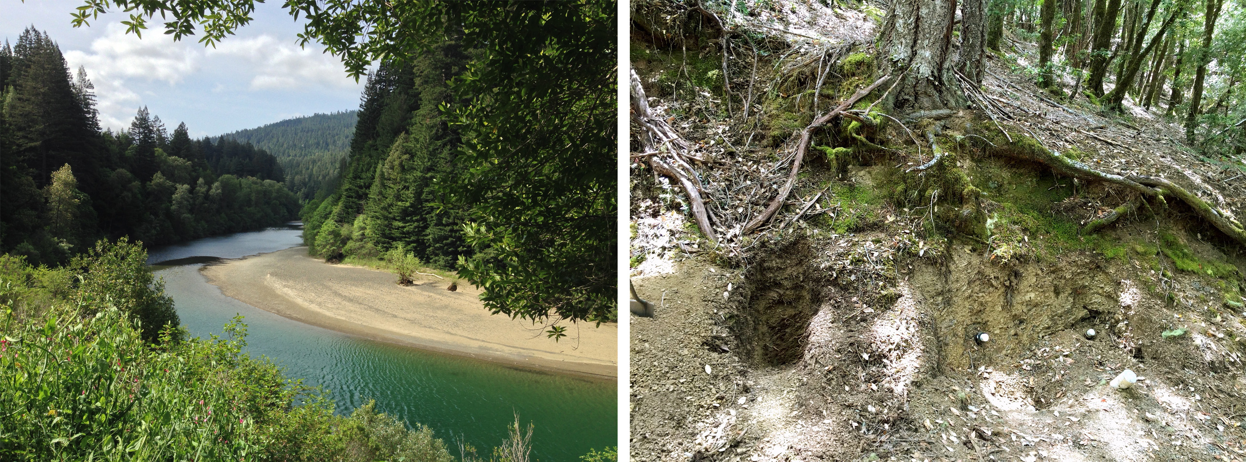 The Angelo Coast Reserve protects thousands of acres of the upper watershed of South Fork of the Eel River in Mendocino County (Image on the left; Credit: Akos Kokai via Flickr, CC BY 2.0). Site where soil samples were taken for this study is shown on the right (Credit: Allison Sharrar).