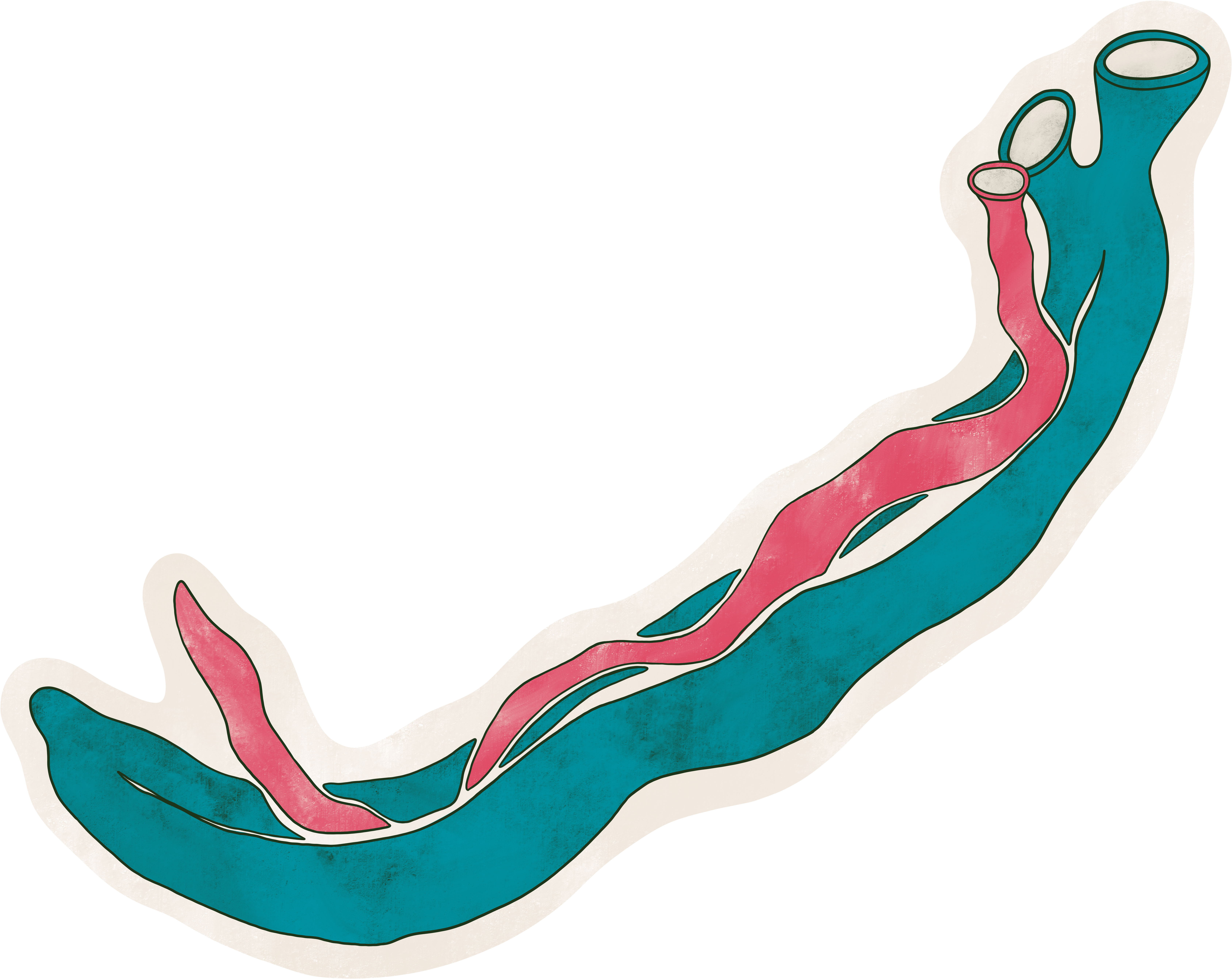| Paired adult schistosomes. Female in red, male in blue.* |