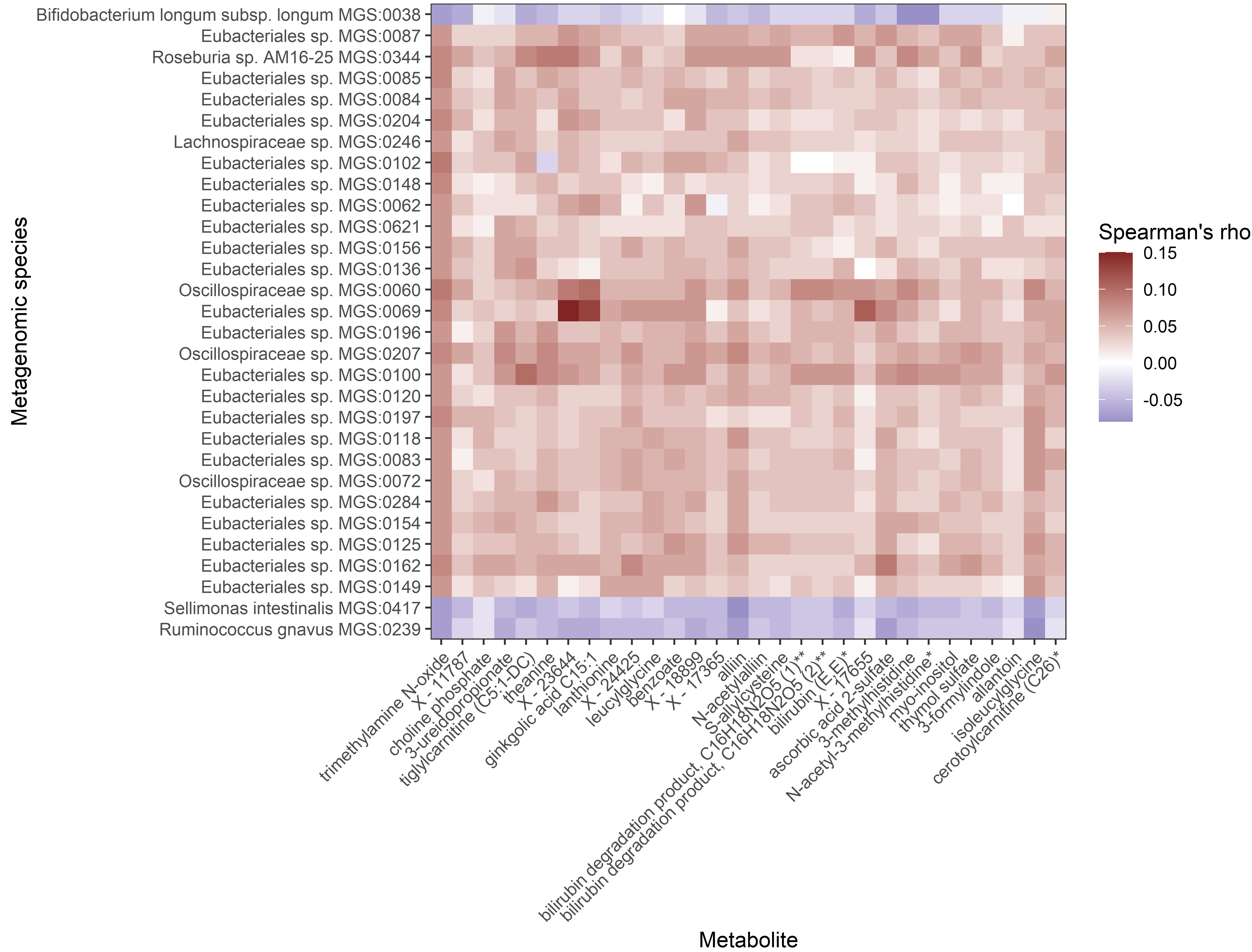If we query the plasma metabolite TMAO in the atlas and visualize its top findings for example, we can see that it is positively associated with many Eubacteriales species and several Oscillospiraceae species. We can also see that TMAO is similar to several of its dietary precursors such as choline and carnitine derivatives in its associations with gut microbiota. These findings, while not completely novel, provide us with clues to additional species involved in the TMAO conversion process.