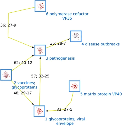 What I found was a reductionist research structure in which the flow of knowledge starts from a cluster of clinical-epidemiological research that describes the problem, towards research at the tissue-cellular level, and then towards biomolecular research which explains the disease and suggest therapeutic interventions, this last level being reflected in the content of patent networks. One of the most interesting aspects of this study was the leadership of the US military both in the generation of scientific knowledge (papers) and in the innovation process (the central assignee in the patent network). Here is the central structure of Ebola research until 2014: