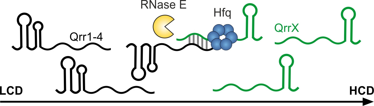 Bacteria can sense their population density through a process called quorum sensing (QS). QS relies on the secretion, detection and response to extracellular signaling molecules termed autoinducers (AI). Thereby, QS controls various complex behaviors in Vibrio cholerae, including virulence factor expression and biofilm formation (1,2). At the core of the QS pathway, four homologous redundant small RNAs (Qrr1-4, sRNAs) regulate the expression of multiple target genes in a cell-density dependent manner and thereby orchestrate collective behavior (3).
