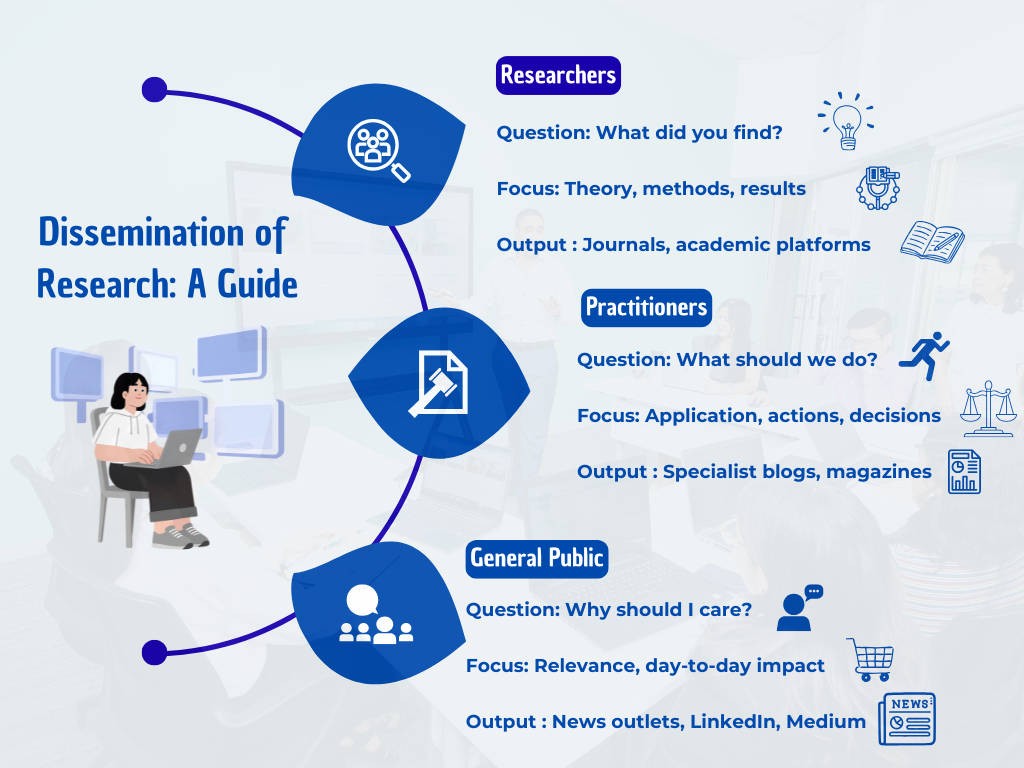 This is where I developed a stronger focus on dissemination rather than academic publication. I began to see research as something to be translated and reshaped rather than just published. The illustration below reflects this perspective, highlighting what I kept in mind when sharing research.