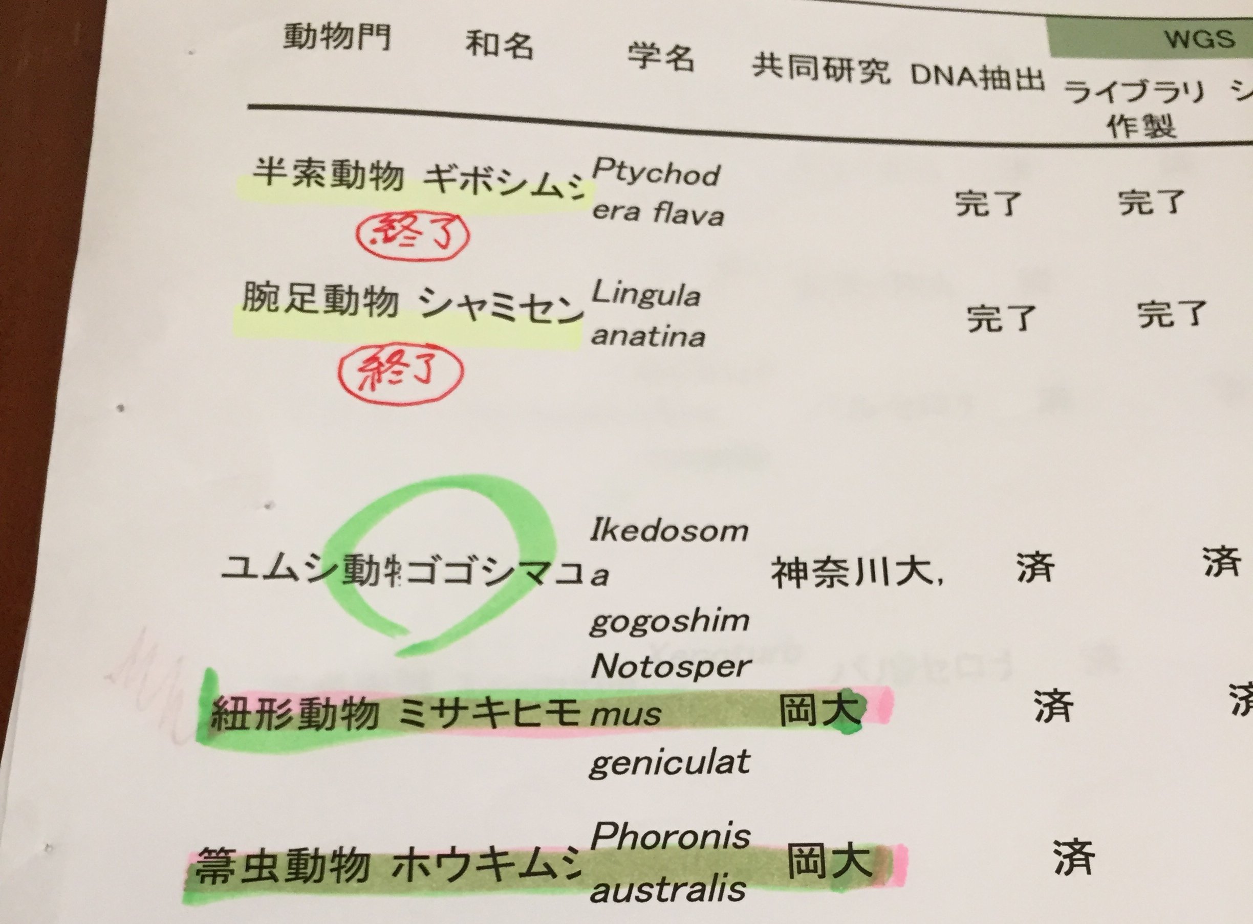 Figure 1 | A snapshot of a corner of Nori’s animal genome list in about 2015, with three genomes on which I had been working. Red circles with kanji indicated completed genome projects. Species highlighted in green denoted genome projects in progress.