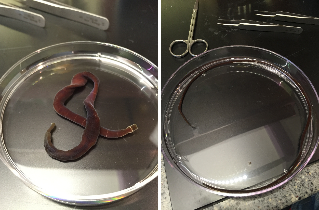 Figure 3 | The nemertean body is usually highly contractile. Left: a contracted worm; Right: an extended worm (species: N. geniculatus). Some nemertean species, such as Lineus longissimus, can reach 30 m. They are probably the longest animal on Earth.