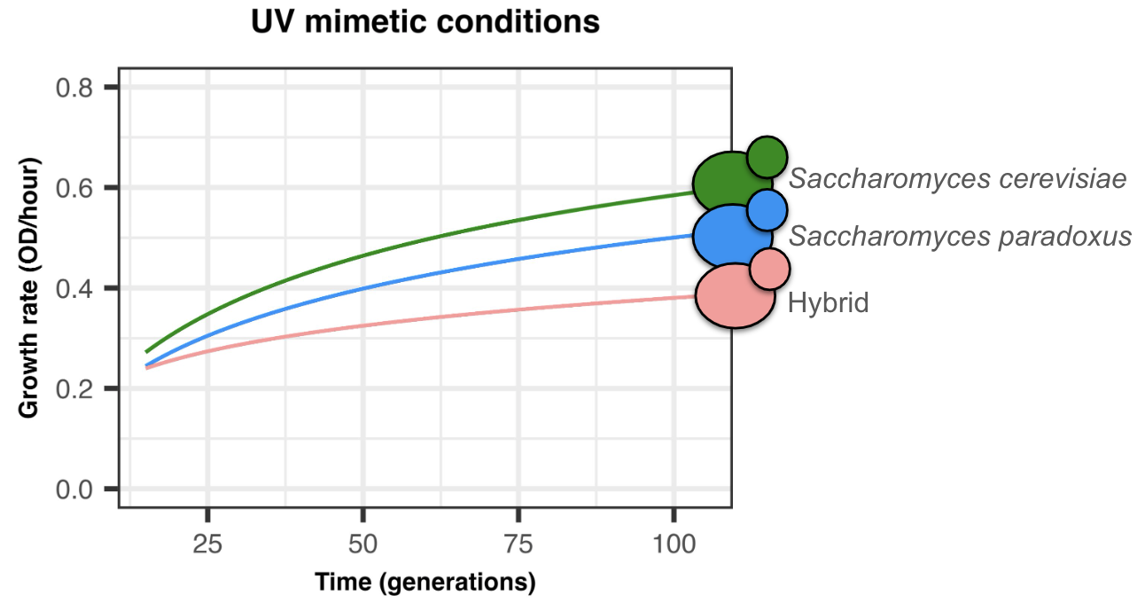 Motivated by these factors, we previously used Saccharomyces cerevisiae and Saccharomyces paradoxus hybrids to test their ability to adapt to a drug that induces genomic instability, simulating UV exposure. After 100 generations of experimental evolution, we found that hybrids show a reduced adaptation compared to their parents (Figure 1) 5.