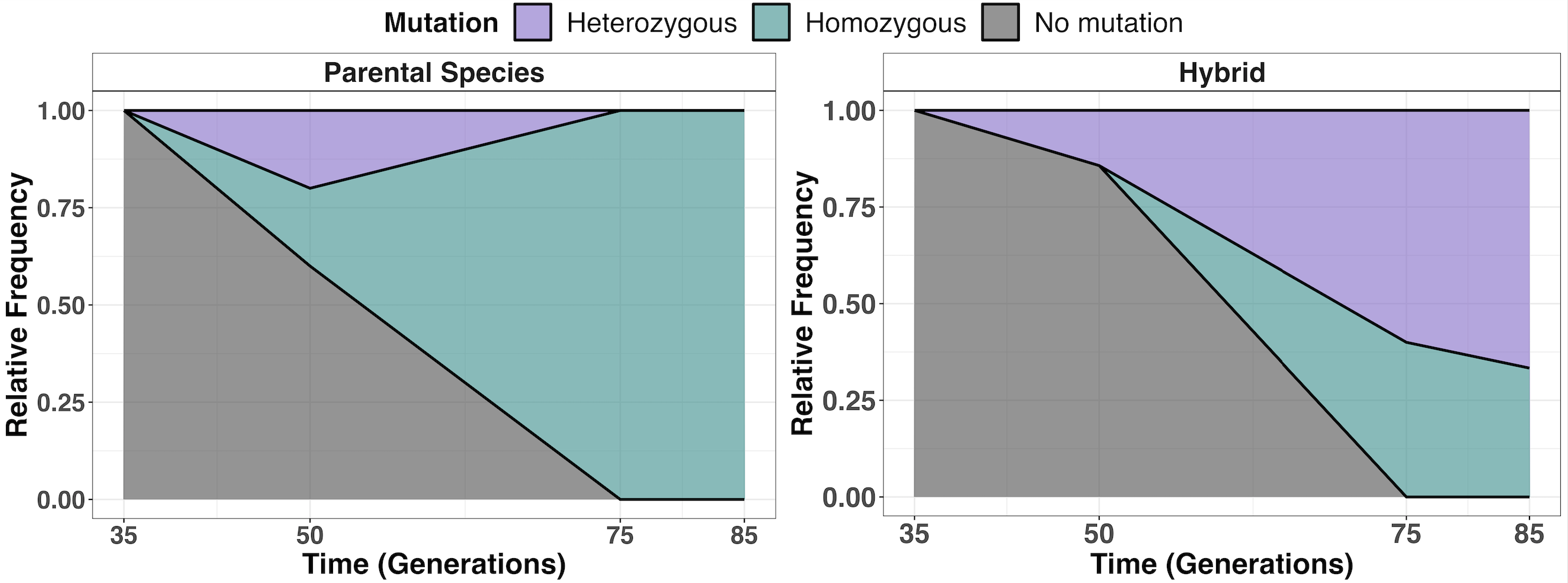 We hypothesized that the lower LOH rate in hybrids might limit their adaptation. To test this, we adopted a 'time machine' approach, analyzing our frozen populations to determine whether LOH occurred faster in parents than in hybrids. We tracked how many parental and hybrid individuals converted their mutations to a homozygous state over time. Our results showed a significantly higher proportion of homozygotes (two copies of the mutation) in parental strains compared to hybrids, confirming that LOH occurs at a slower pace in hybrids (Figure 3).