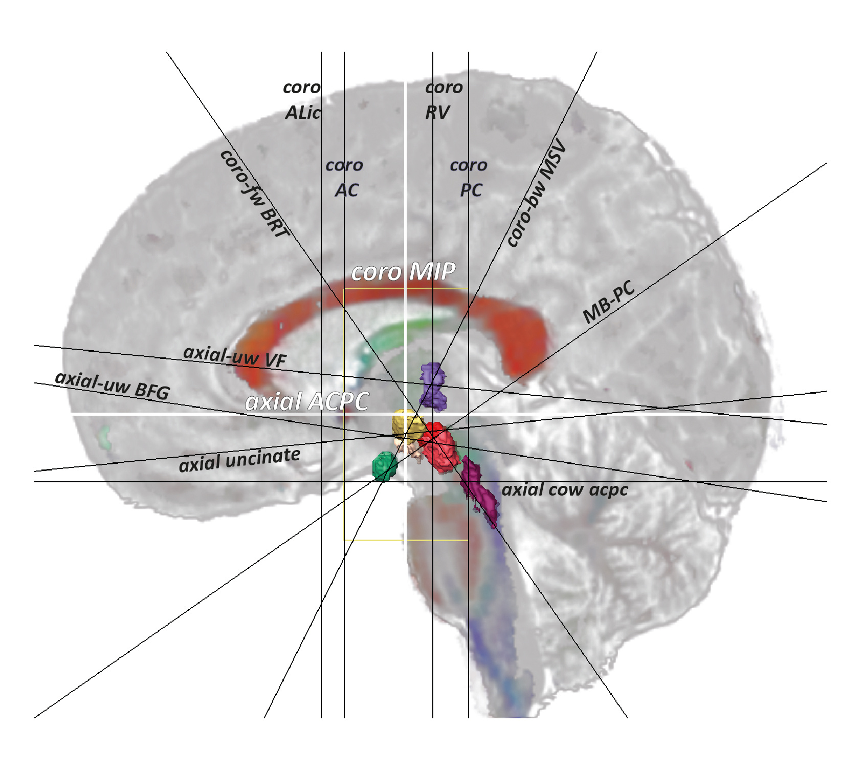 Figure 1: Locations of reference slices (see manuscript for details; lateral view, midline slice merging WAIR and DCE): coro MIP, axial ACPC, coro-fw BRT, coro-bw MSV, coro ALic, coro AC, coro PC, coro RV, MB-PC axial-uw VF, axial-uw BFG, axial uncinate and the axial cow acpc; ACPC system (yellow box), y-length (ACPC length)=30 mm, z-height=60 mm; 3D views of red nucleus (red), mammillary body (green), subthalamic nucleus (yellow), ventral tegmental area (beige), nucleus ventrointermediate of thalamus (purple) and pedunculopontine nucleus (carmine).