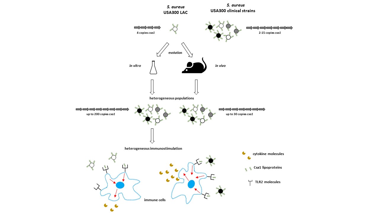Although the function of Csa1 is unknown, S. aureus lipoproteins are known to bind the toll-like receptor 2 (TLR2) on mammalian immune cells thereby triggering host immune responses, e.g. secretion of cytokines and chemokines. Intriguingly, we found that strains carrying csa1 amplification displayed an increased immunostimulatory capacity, i.e. the higher the copy number, the greater the production of cytokines by the stimulated immune cells. This phenotype was strictly dependent on csa1 functionality since nonsense mutations in csa1 abolished the effect of amplification. Therefore, we asked whether csa1 amplification occurred in vivo, when different selective pressures may act on the array. We detected bacterial strains with amplifications in five out of six mice in our experiments and amplification frequencies were significantly higher than those observed in any in vitro experiment. Additionally, we did not detect amplification in vivo when the csa1 array was inactivated, strongly suggesting that protein overexpression provides a selective advantage in vivo. Unexpectedly, when we compared the virulence of strains harboring different copies of csa1 genes we did not find that copy number correlated with virulence. This suggests that: i) csa1 copy number variation may endow the bacteria with the ability to escape immune recognition rather than enhance their virulence; ii) There is a tradeoff between the benefits and the drawbacks associated with carrying an increased number of csa1 genes.