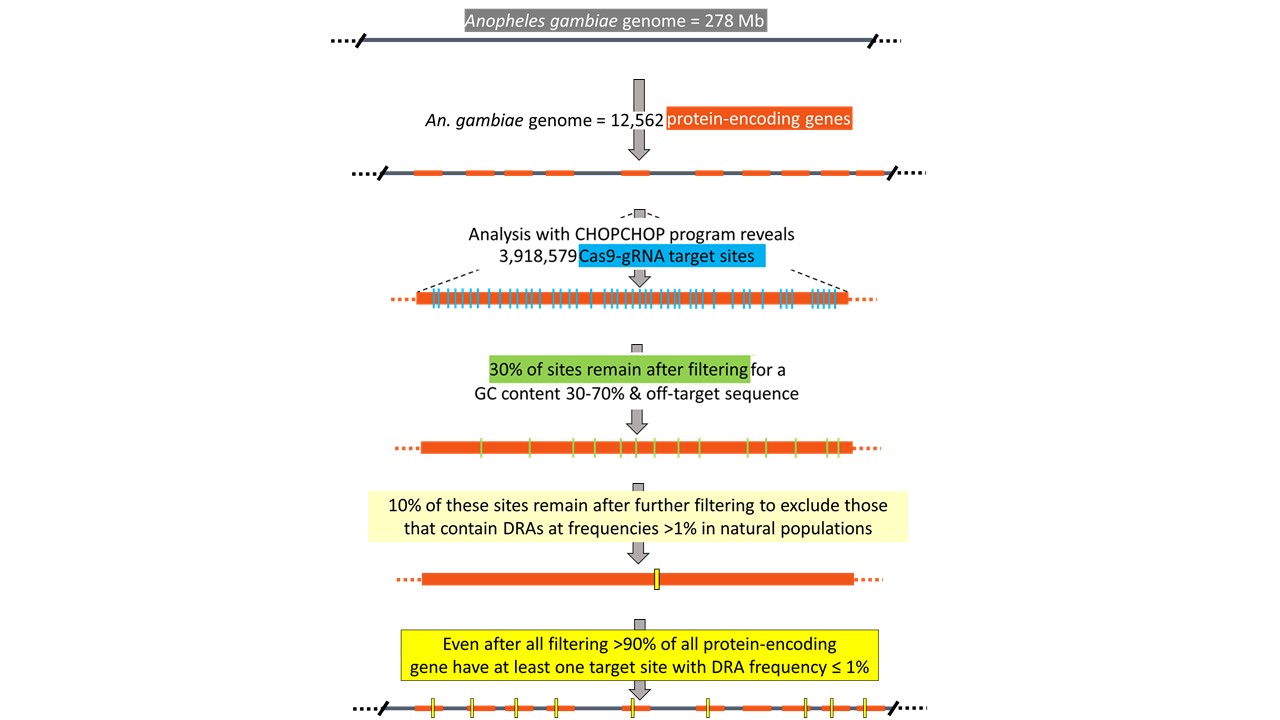 We examined hundreds of individual field collected mosquito genomes. Three species were included: the primary African malaria vectors, Anopheles gambiae and An. coluzzii, and the vector of the chikungunya, dengue, Yellow Fever, and Zika viruses, Aedes aegypti. We used the command line version of the tool CHOPCHOP (v2) to locate possible CRISPR/Cas9 target sites in all protein coding genes in the reference genome of each species. Sites were filtered for high specificity (no off-target sites with <4 mismatches in the genome) and GC content (30 – 70%). We produced a conservative estimate, more likely too low than too high. We then screened potential target sites for variants identified from whole-genome sequences of 1,280 field collected mosquitos. Five datasets were analyzed independently: 111 An. gambiae, 100 An. coluzzii, and 132 Ae. aegypti from our lab, along with 654 An. gambiae and 283 An. coluzzii from the Ag1000g Consortium. This protocol is summarized in Figure 1.