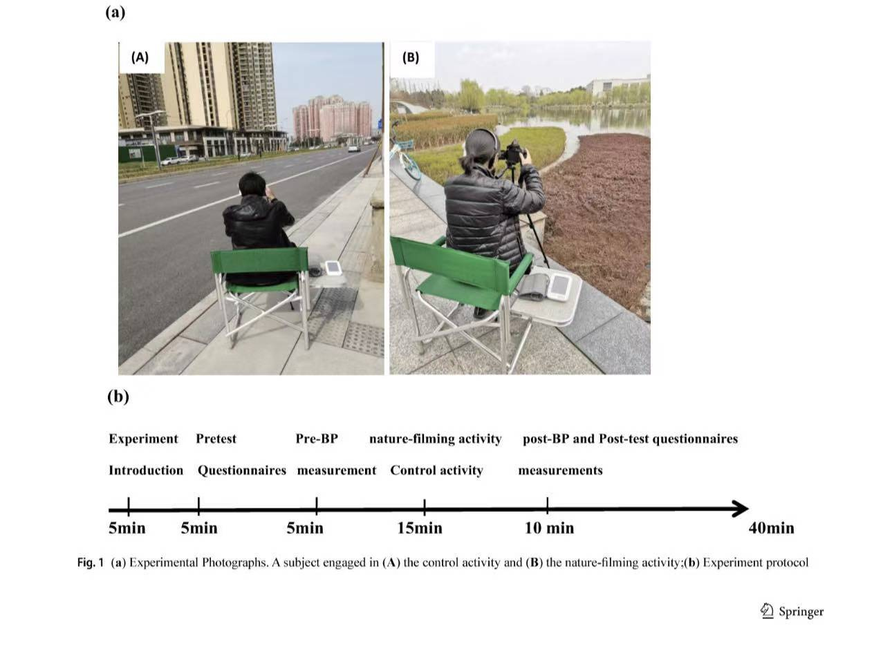 The increasing use of technological devices has contributed to rising psychological stress among young people. Effectively managing this stress is essential for improving mental health and reducing its impact. This study examines the psychophysiological benefits of participating in a 15-min nature-based filming activity among modern Chinese adults. Participants were instructed to create a nature-themed film using a camera, and their experiences were compared to a control activity involving city-themed filmmaking for the same duration. Various measures, including blood pressure, the State-Trait Anxiety Inventory (STAI-S), electroencephalography (EEG), and the semantic differential method (SDM), were used to assess the effects of both activities.The results showed significant reductions in both diastolic and systolic blood pressure, along with notable changes in brain activity, during the nature-based filming. Psychological responses indicated that participants felt “moderately relaxed,” “moderately comfortable,” and “moderately natural,” with lower anxiety levels after the nature-based filming compared to the control group. These findings suggest that engaging in outdoor, nature-based filming can effectively reduce psychophysiological stress in Chinese adults.