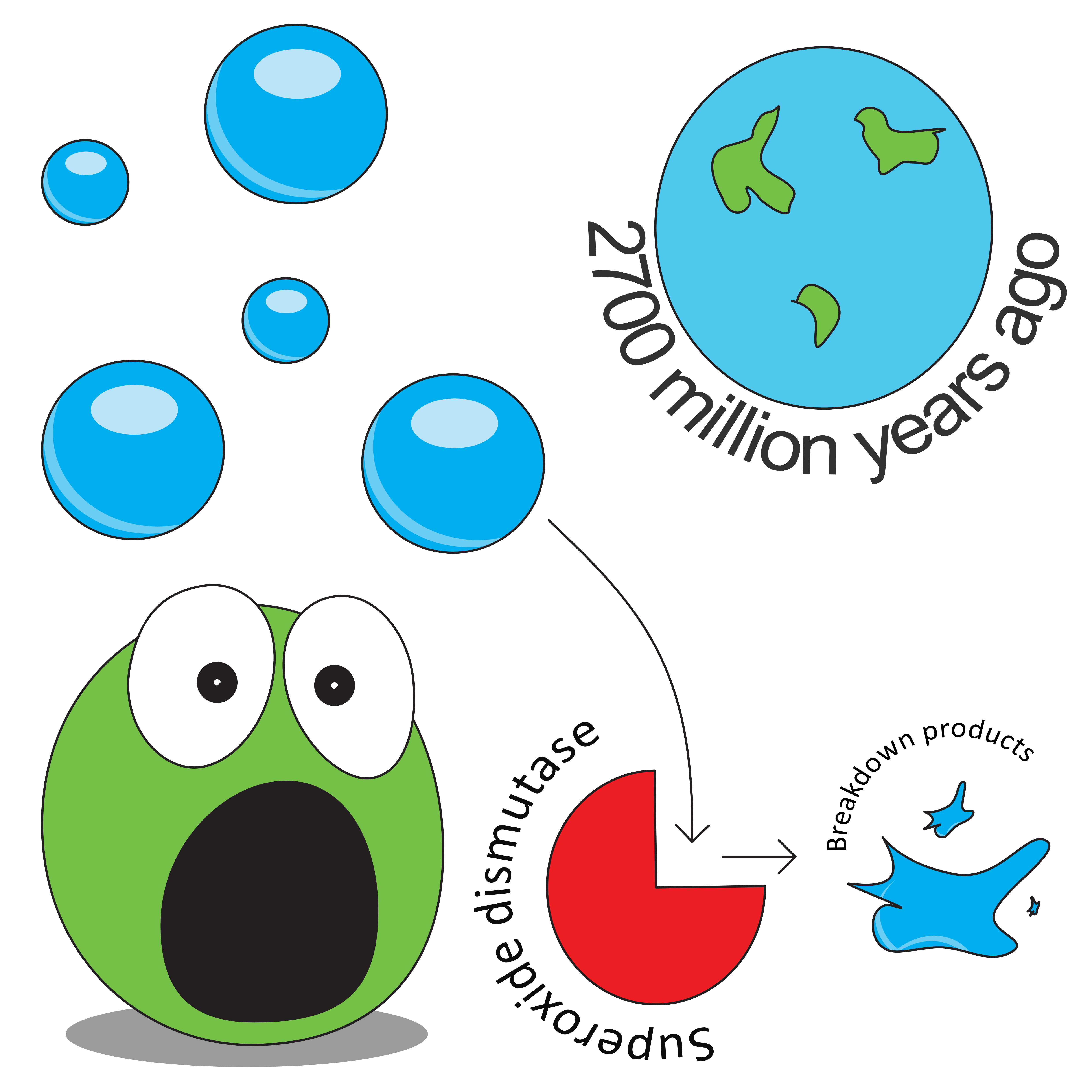 Armed with the knowledge that oxygen-producing cyanobacteria had existed for 3300 to 3500 million years, we investigated how they dealt with the oxygen they produced. Why? Because oxygen is a molecule of two sides. It is essential for aerobic life (including animals) but can also be dangerous in the wrong circumstances, where it reacts to produce unhealthy quantities of reactive oxygen species (ROS). To cope with these ROS, modern life has evolved strategies such as pigments called carotenoids and a wealth of antioxidant enzymes to remove them. In this project, we studied the evolutionary history of four of these antioxidant enzymes: NiSOD, CuZnSOD and Fe- and Mn-utilising SODs. Such SODs are found in everything from animals to plants and bacteria, where they manage ROS by converting superoxide free radicals into hydrogen peroxide (Miller, 2012).
