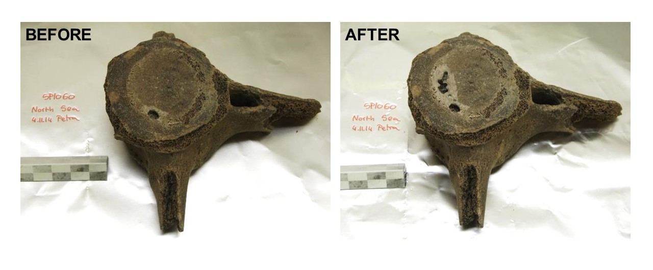 The subfossils of bottlenose dolphins were dredged from the bottom of the North Sea during fishing operations. They are now curated at the Natural History Museum of Rotterdam, and present an exceptional opportunity to work on the adaptation of bottlenose dolphins to coastal habitat. As these bones have been sitting at the bottom of the sea for thousands of years they have been subjected to microbial and other animal activity since the organism’s death, and this was no exception for specimen SP1060 (Figure 2). This partial vertebra fragment has a rough crumbling dark surface, and is extremely porous and brittle from prolonged water damage. Endogenous DNA (i.e. DNA from a dolphin instead of microbial or from any other species) preservation in the bone varies substantially, from 0.01% to about 5%. Luckily, this bone was one of several bones used to test a more controlled bleach decontamination approach 6 to increase the fraction of endogenous DNA prior to Illumina single stranded library preparation and sequencing. The bleach treated bone powder extract now contained around 44% DNA fragments that mapped to the dolphin reference genome. This allowed us to generate a high quality genome for the SP1060 individual, and reduced sequencing costs. We also generated whole genome sequencing data from three other subfossil specimens, using other methods aiming to get more DNA from the dolphins than microbes or other animals. We did not reach as high an endogenous content as for SP1060.