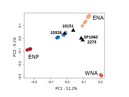 Figure 3. Principal component analysis of data from four ancient samples projected on the PCs of 60 contemporary samples (coastal in shades of red and pelagic in shade of blue) showing first and second PCs based on 624,969 SNPs. The proportion of genetic variance captured by each component is indicated in the axes.