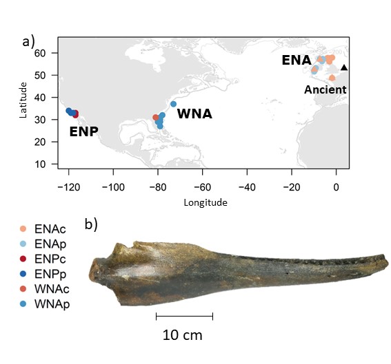 Figure 1. a) Sampling locations of the four ancient (black triangle) and 60 contemporary coastal (denoted with postscript ‘c’ and shown in shades of red) and pelagic (postscript ‘p’ and in shades of blue) bottlenose dolphins in the eastern North Atlantic (ENAc and ENAp), western North Atlantic (WNAc and WNAp) and eastern North Pacific (ENPc and ENPp). b) Mandible of a subfossil bottlenose dolphin (sample NMR10326) included in our study.