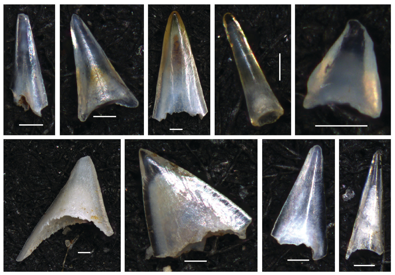 In order to study the impact that this extreme climate event had on ancient fish, we first had to find the fish. Fish are the most common vertebrates on the planet, but they’re rare in the fossil record. When a fish dies in the open ocean, their remains sink all the way to the sea floor, where their microscopic teeth can be preserved in the sediment. Fossil fish teeth, usually smaller than the width of a human hair (~100 microns) but are made of tougher stuff than their bones, and are therefore found in nearly all marine sediments. They provide an unparalleled glimpse into past fish and marine ecosystems at a very fine time resolution – the perfect tool for studying the relationship between fish and climate change in the past.