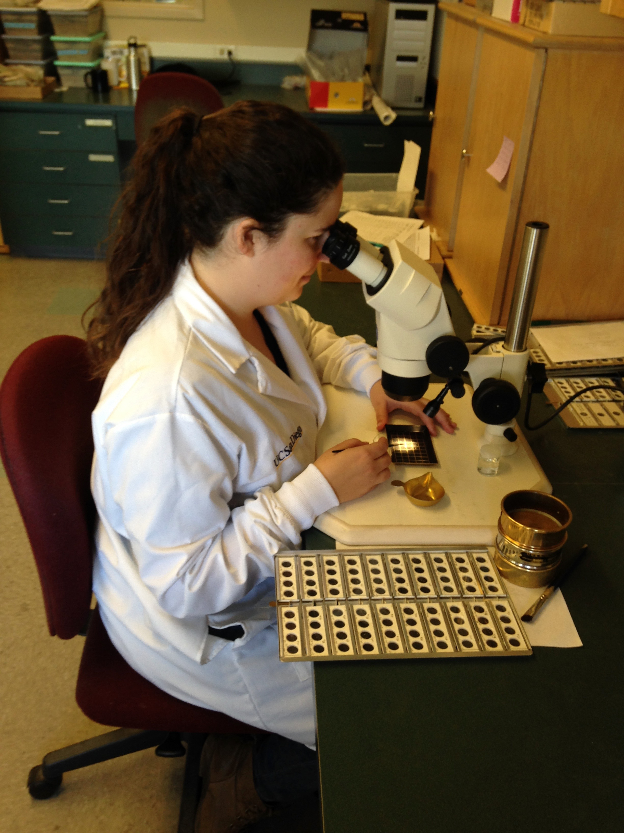 IMAGE DESCRIPTION: Image is of a white woman in a research laboratory, wearing a lab coat and sitting at a microscope with a tray under it. She is holding a paintbrush, which is used to move fossils from the tray into cardboard slides for storage.
