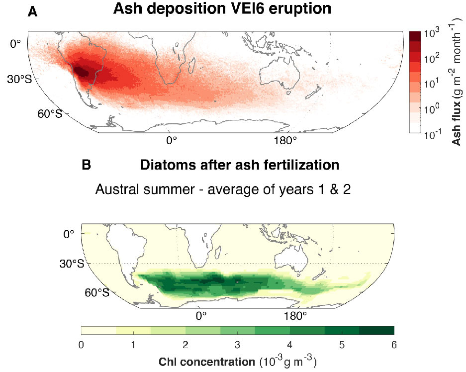 Figure 2. Model simulation showing that A. ash deposition (climatology: 2014-2023) associated with volcanism in the Central Andes (with Late Miocene emission magnitude) corresponds to B. an increase in diatom chlorophyll concentration during austral summer (December to February) averaged for the first and second years after a month-long pulse of nutrients applied on December 1st of year 1.