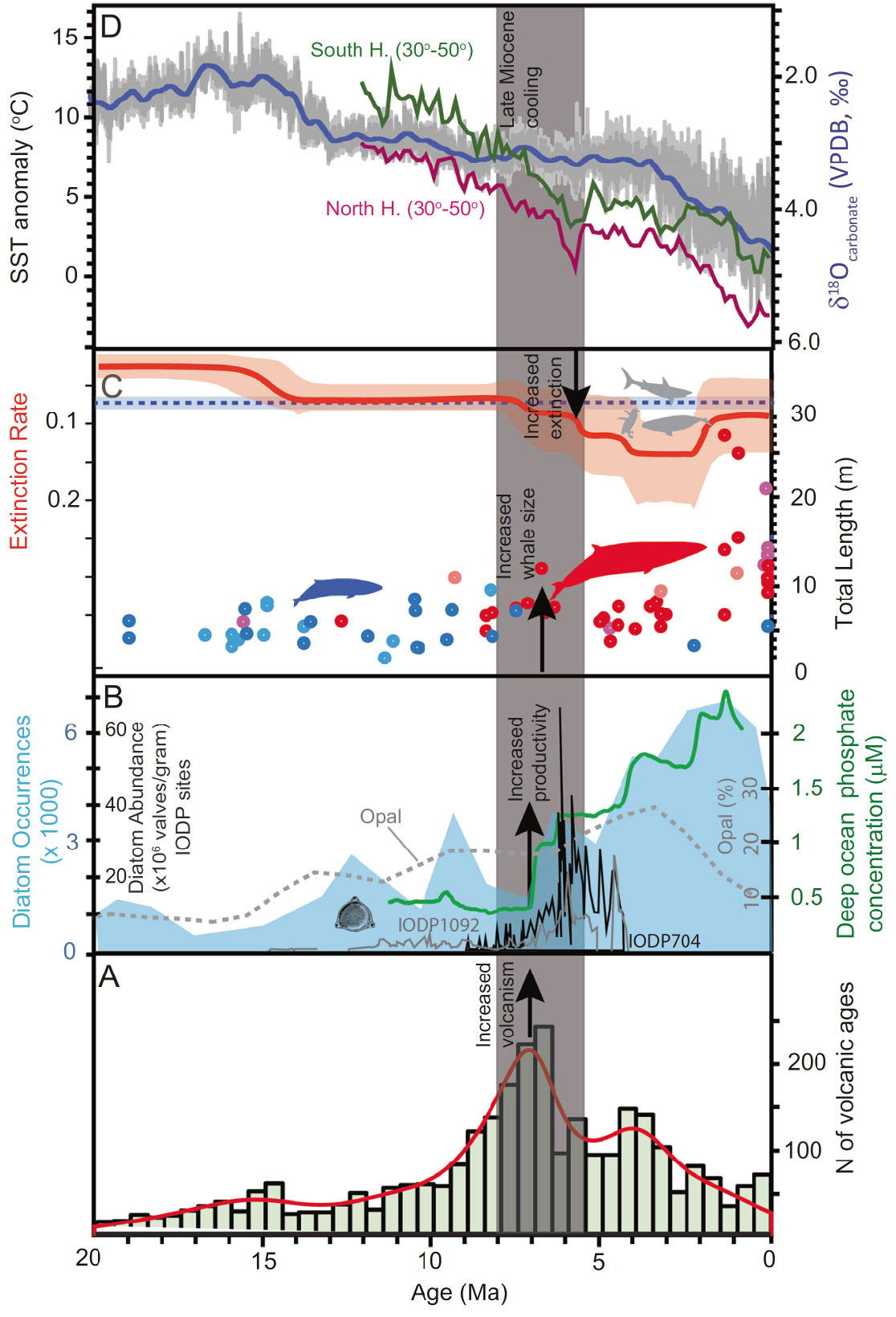 changes on marine vertebrates (C) and sea surface temperatures (D) and the Late Miocene cooling.