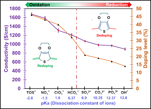 The electrical conductivity of, and doping level within, the PEDOT layer after exposing to an anion solution depends on the dissociation constant of the anion's conjugate acid. At higher pKa values, when the PEDOT is exposed to these anions they lead to hydrolysis of the polymer. (at low pKa the PEDOT is doped by the anion, following the widely accepted doping mechanism).