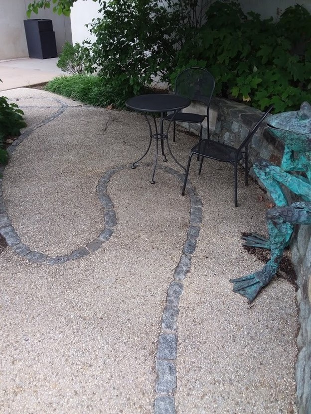A year later, the construction of Anita's garden was completed. In that triangle area, a frog sits on the short wall, posing like Rodin's "Le Penseur". The two trees weave their branches behind the frog when the breeze passes by, with some wildflowers around them. Two lovely sets of tables and chairs are placed under the trees. There is a small stone plaque with Anita's name on it. It doesn’t have to be obvious, because the pattern on the ground already tells the main story: the schematic secondary structure of TGF-beta. It is Anita's ribbon. I believe the sculptor will like that it is also similar to the breast cancer ribbon.