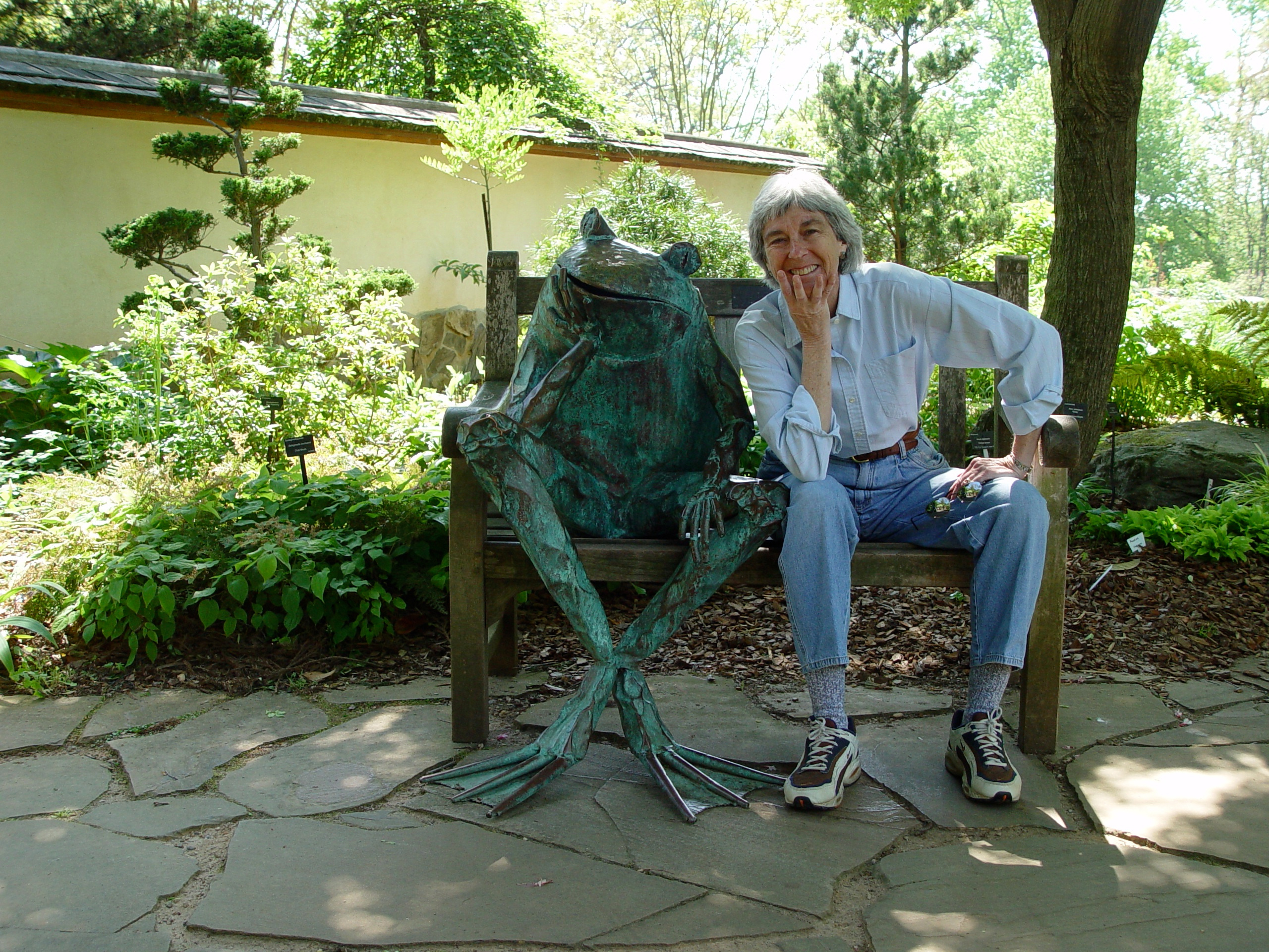 Anita with “Frog the Thinker” statue at the botanic garden in Atlanta.
