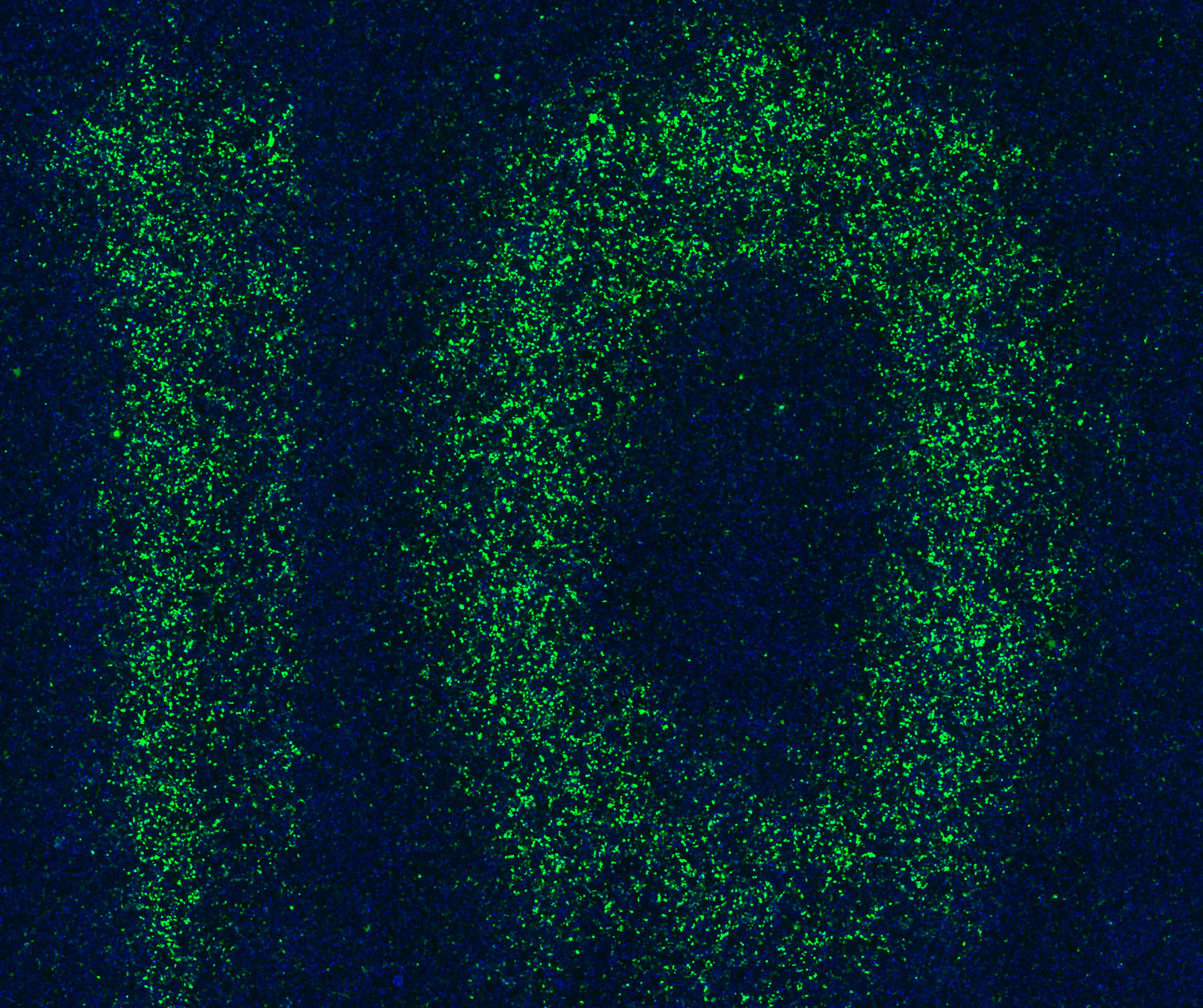 Lauren Polstein and Charles Gersbach at Duke University used light-sensitive transcriptional activators to photoactivate a GFP reporter in mammalian cells in the shape of the number 10.