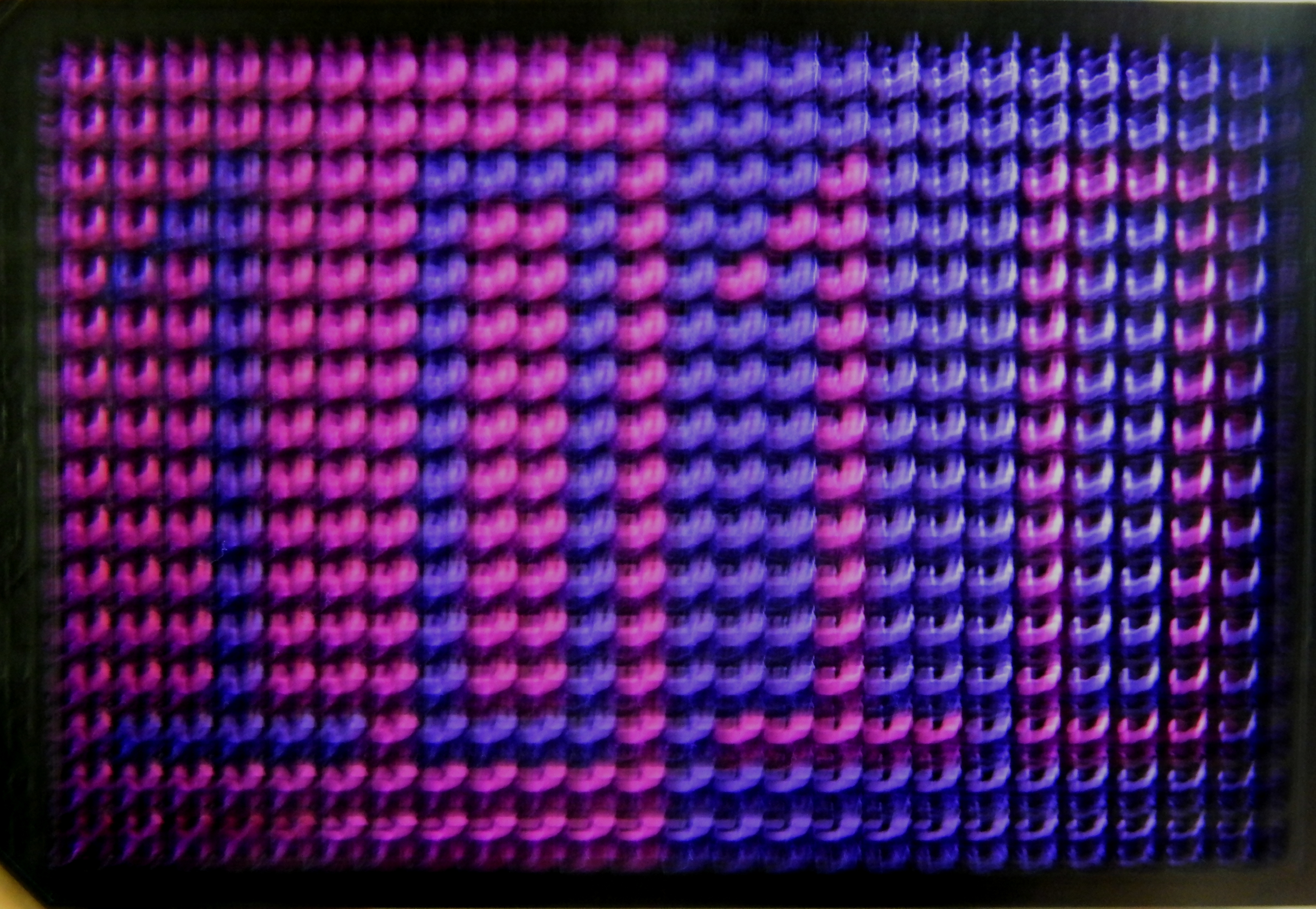 Sandra Duffy at Griffith University based her image on indicators of cell viability. Cytotoxic compounds were added to mammalian cells in a 384-well microtiter plate, either in the shape of a 10 in one half of the plate, or to all wells outside the shape of a 10 in the other half of the plate. After incubation, a cell viability marker (resazurin) was added to the wells. Viable cells convert the blue reagent to red, and the image was taken with a simple point-and-shoot camera.