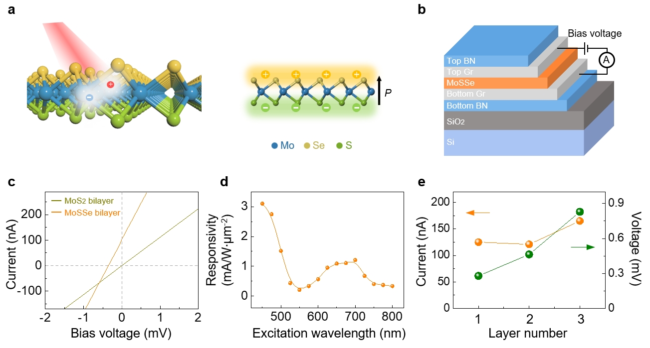 Fig. 1︱Polar structure of the Janus MoSSe monolayer and spontaneous photovoltaic effect in the MoSSe devices. a, Structure of the Janus MoSSe monolayer and the generation of the electron-hole pairs (circles with + and - signs) under optical illumination (left). b, Schematic of the photovoltaic device. c, Short-circuit photocurrent of the MoSSe bilayer and MoS2 bilayer devices as a function of bias voltage under the same illumination conditions. The nonzero photocurrent at zero bias voltage indicates spontaneous photovoltaic responses in the MoSSe device. d, Excitation wavelength-dependent photocurrent responsivity. This peak corresponds to the exciton resonance of MoSSe. e, Layer dependence of the short-circuit current and open-circuit voltage in the MoSSe device. With increasing layer number, the photocurrent remains nearly unchanged, while the voltage increases accordingly.